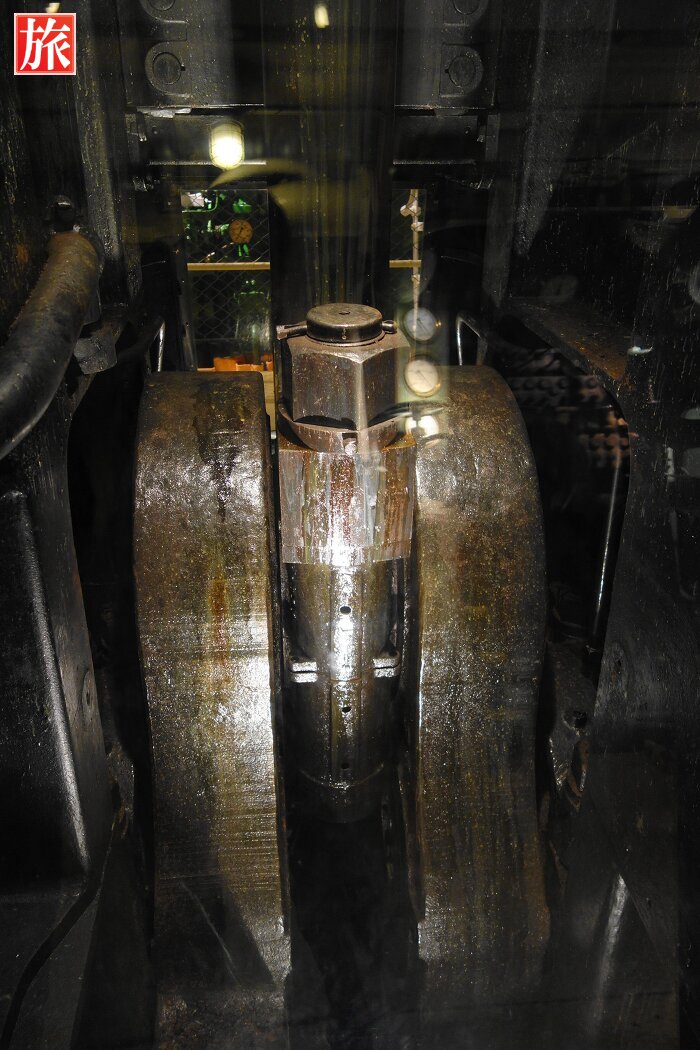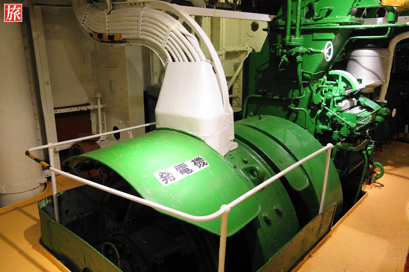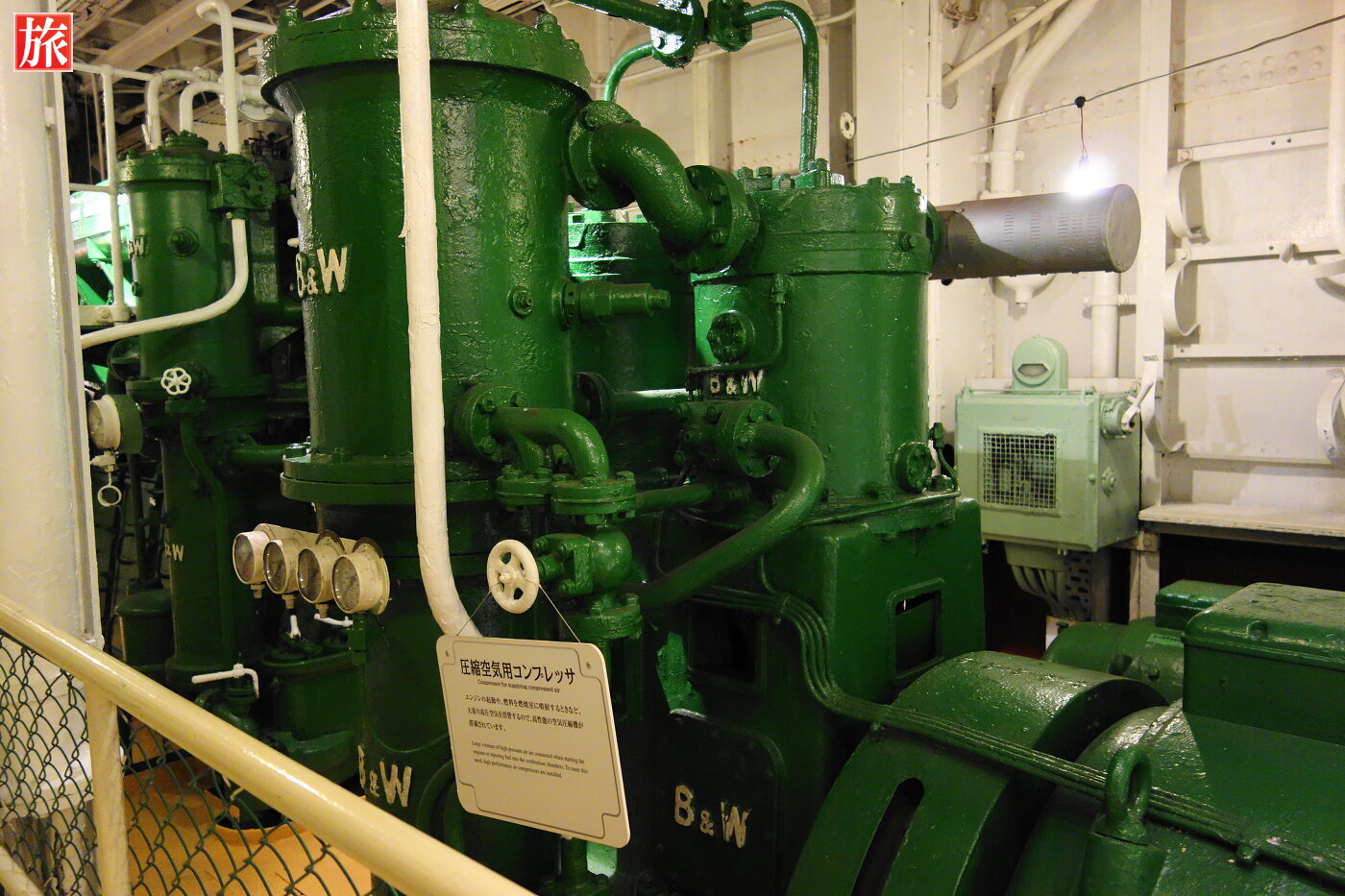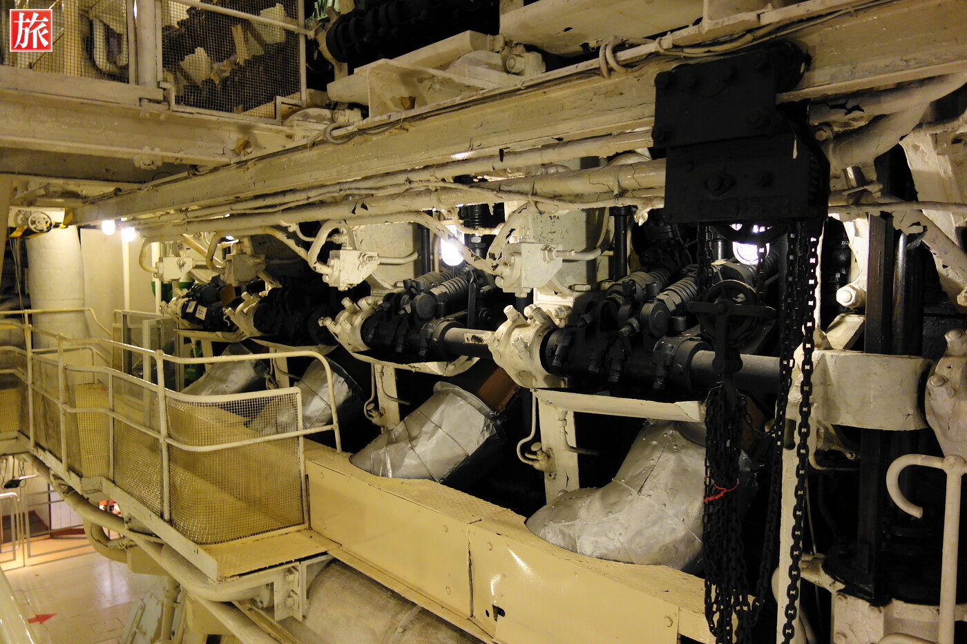 スクリューを回す巨大なクランク。発電機。圧縮空気用コンプレッサ。圧縮空気はエンジンの燃料の高圧噴射用などに利用されたそうです。