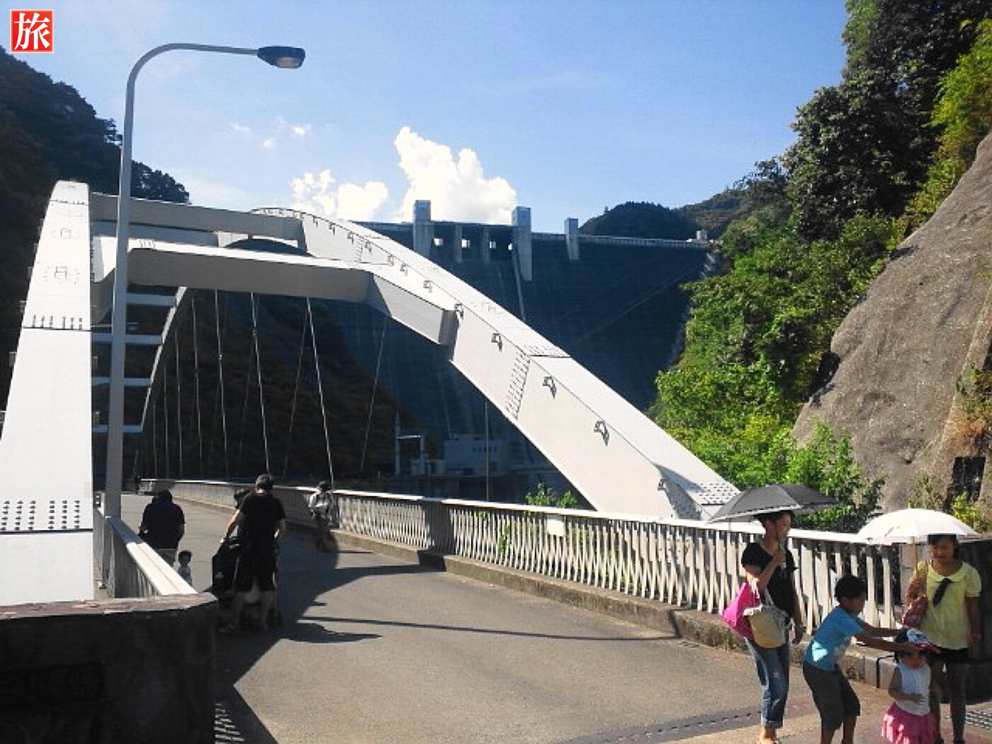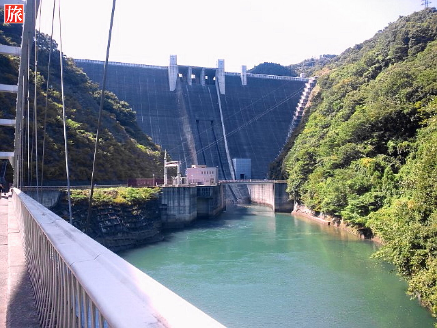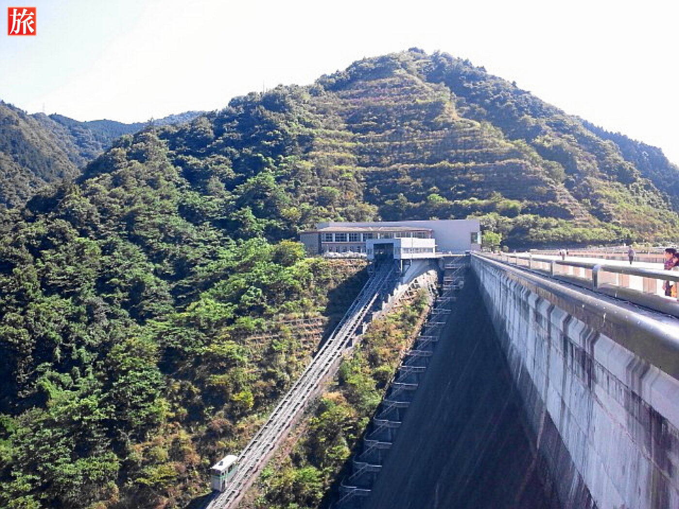インクライン(ダムを建設するために使われた施設で、完成後はダムの上下を結ぶケーブルカーとして活用されています)が走っています。ダム上のエレベータ乗り場。
