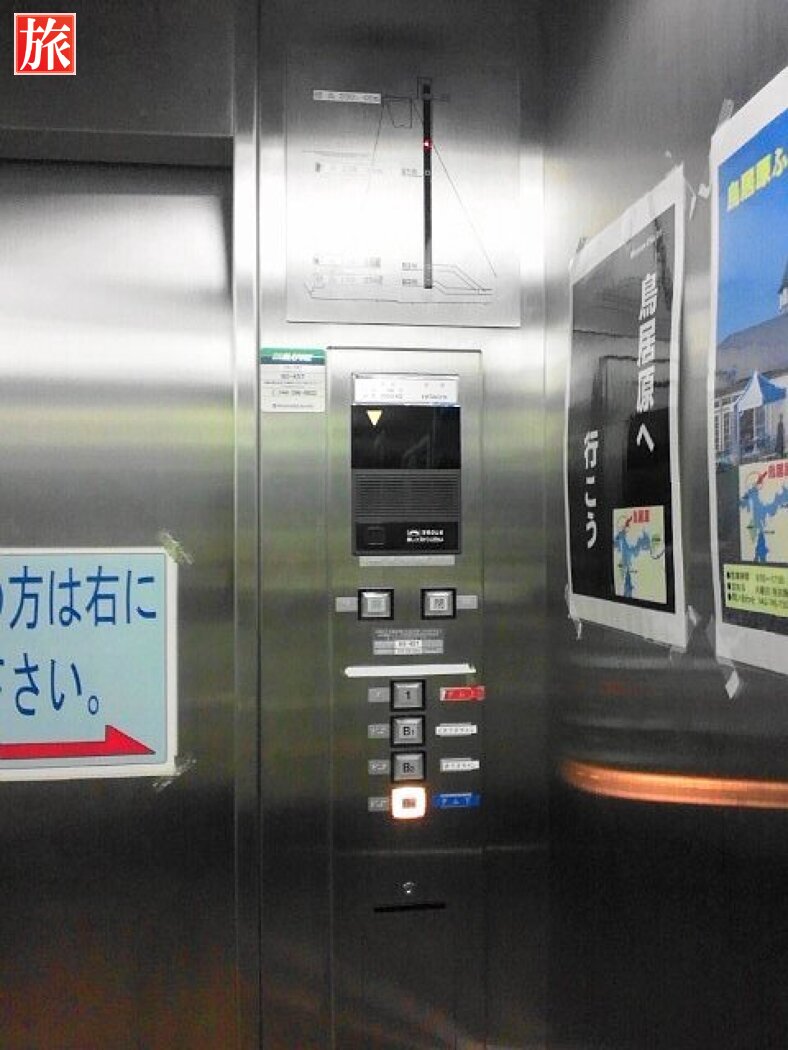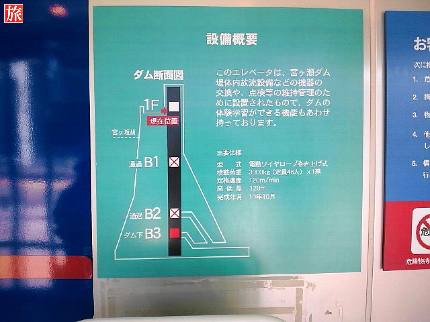 ダム下のエレベータに通じる通路は冷んやりしています。外は30度を超えるのにエレベータ通路は20度以下です。エレベータの設備概要の説明。エレベータ内の様子。ダム上に着きました。