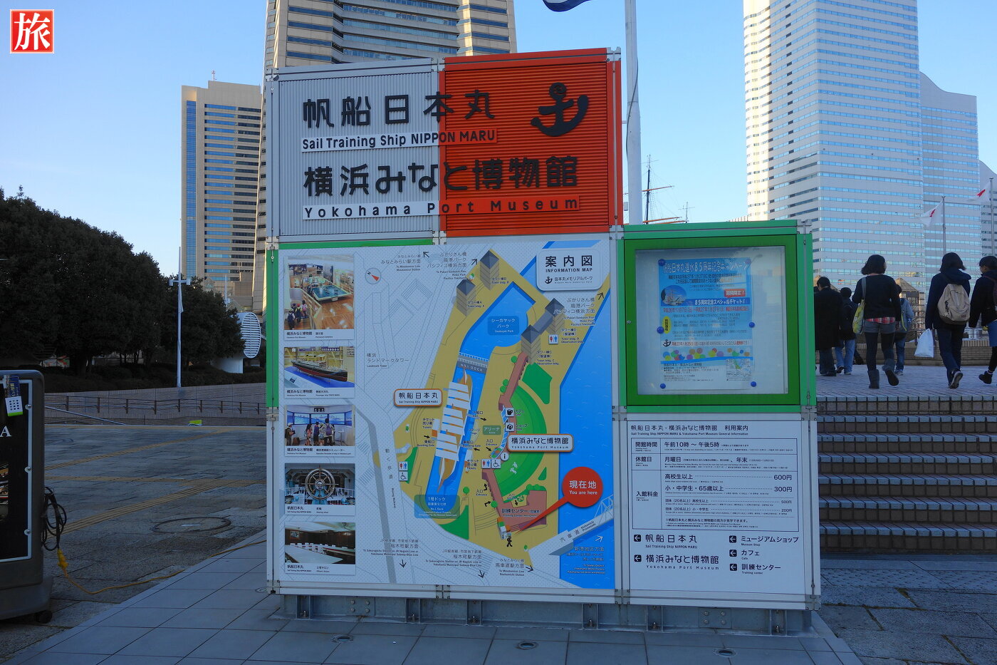 横浜みなと博物館から見たコスモクロック21。帆船日本丸・横浜みなと博物館の案内図。帆船日本丸を船首方向から眺めた風景。