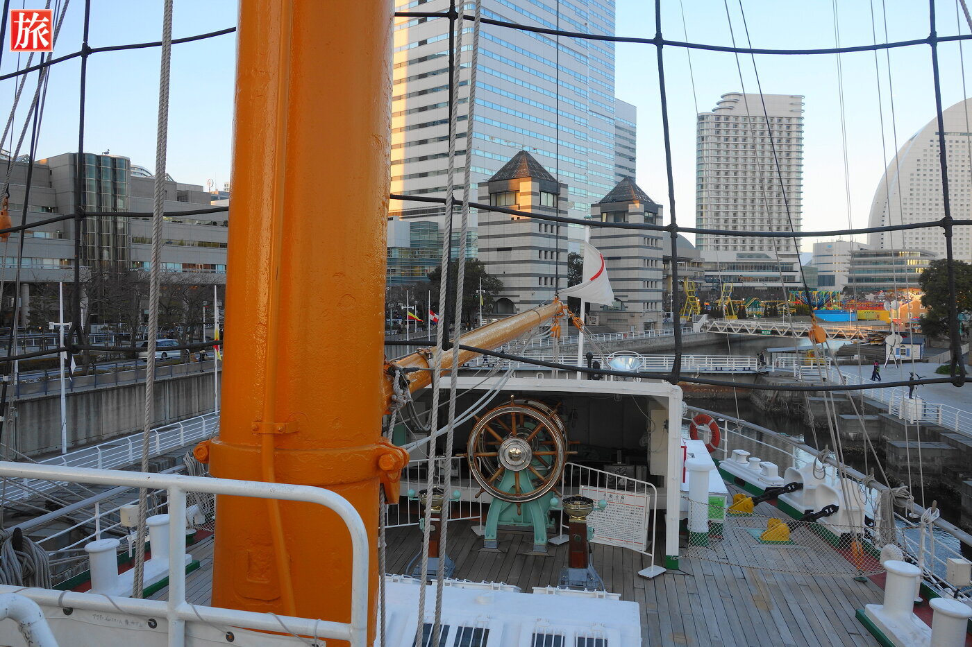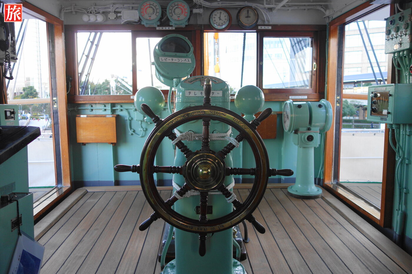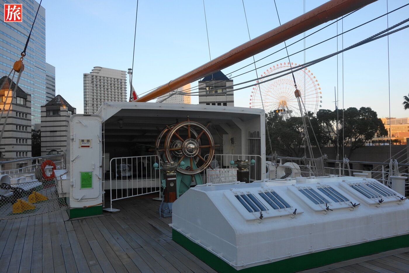 操舵室内の様子。操舵室付近から木甲板を望む。船首方向。大観覧車「コスモクロック21」方向。