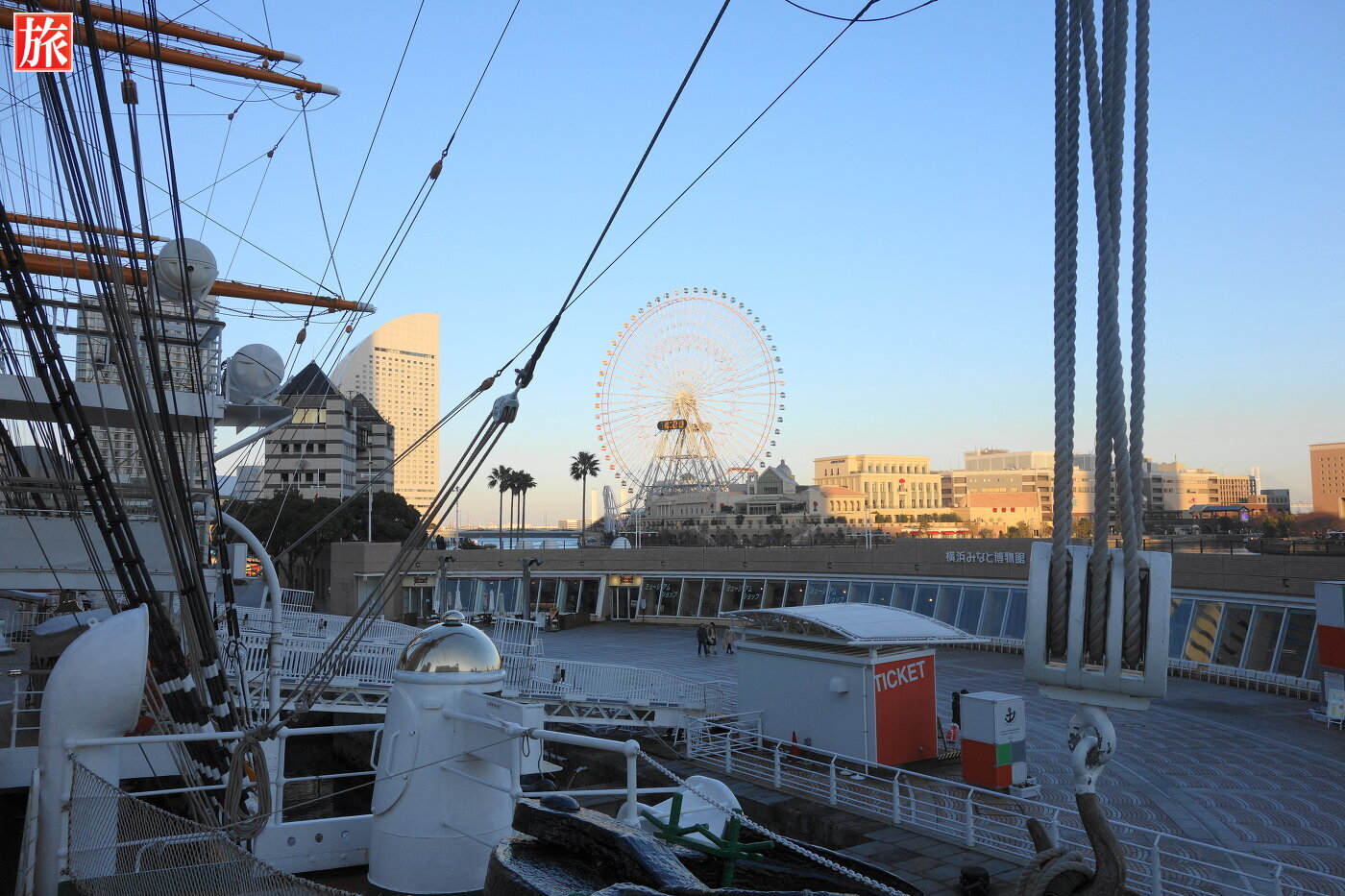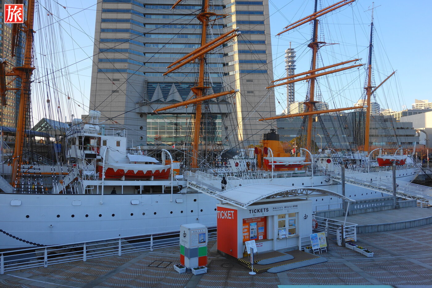日本丸と隣には横浜ランドマークタワーがそびえ建ちます。入場チケット売り場。