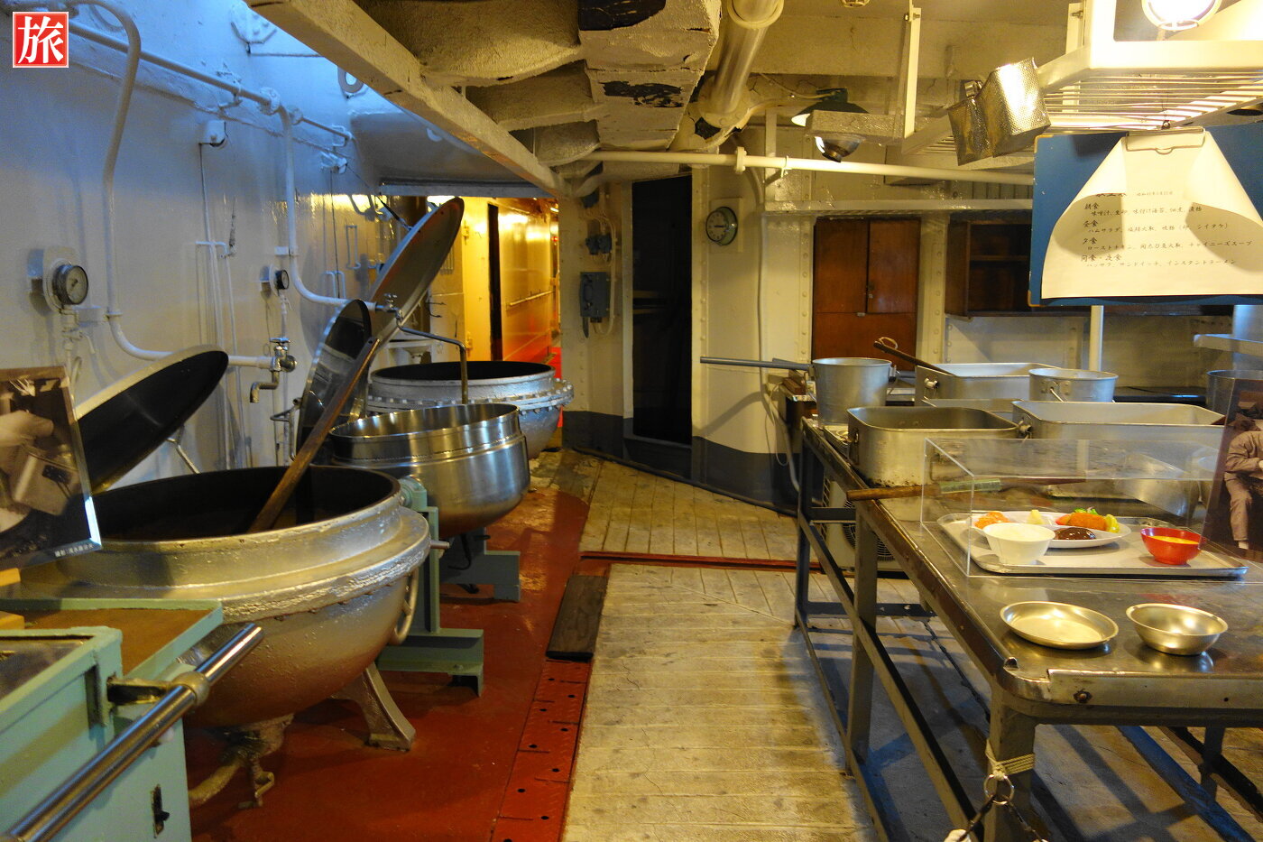 調理室。夜食を含めて1日4回、10名程度の部員が百数十名分の食事を作っていたそうです。炊飯器(ライスボイラー)、煮物用鍋はそれぞれ150人分。食堂。