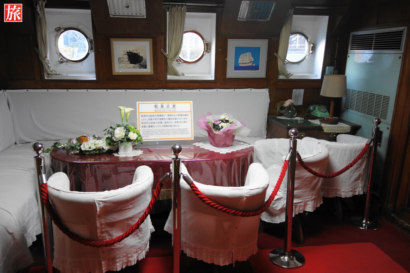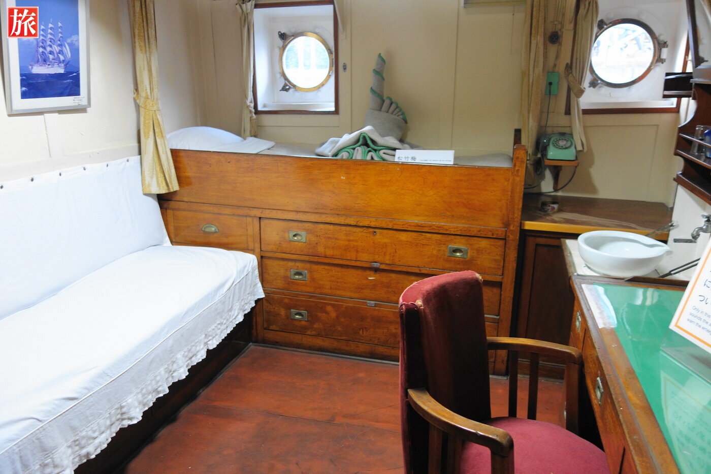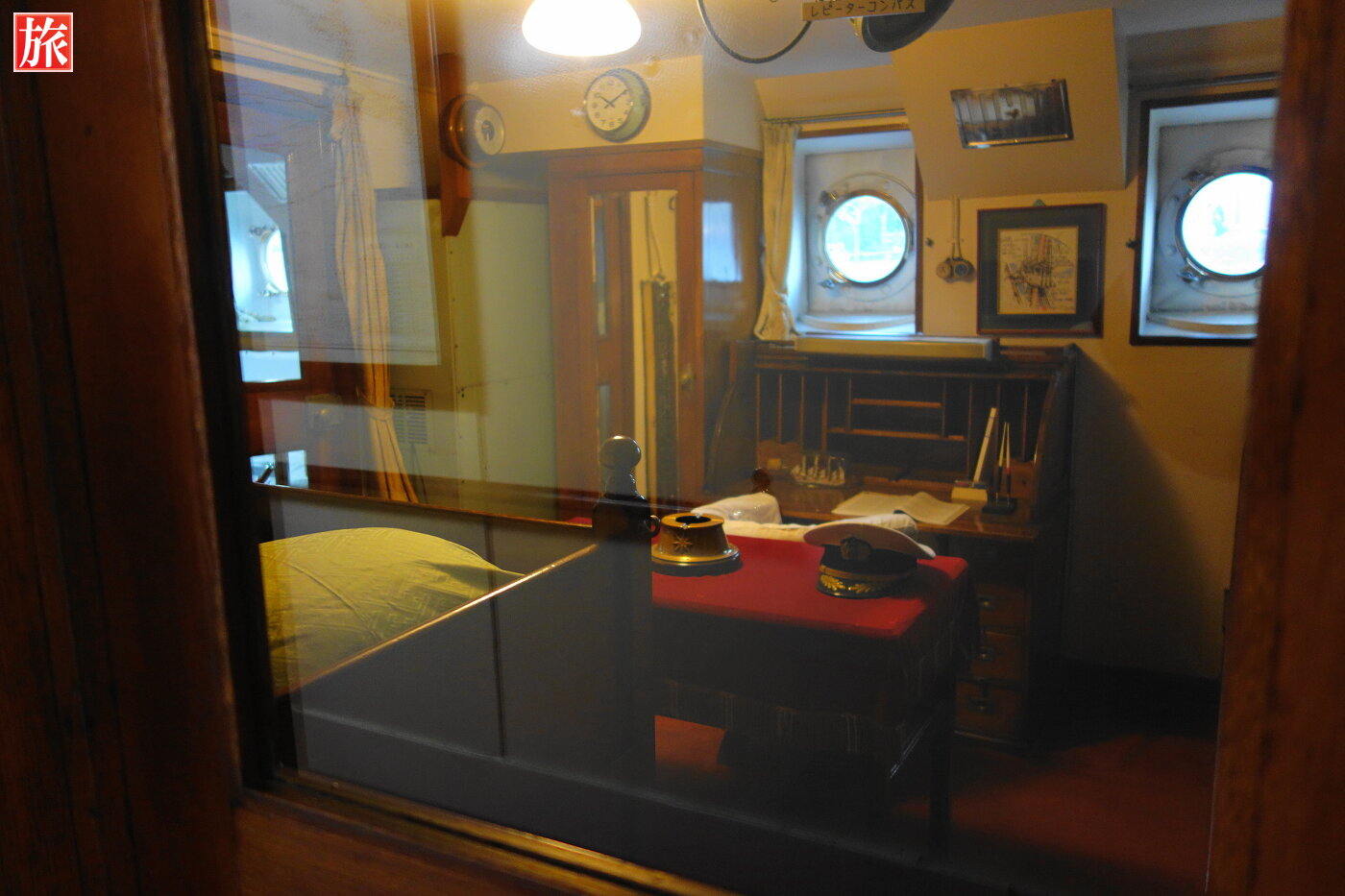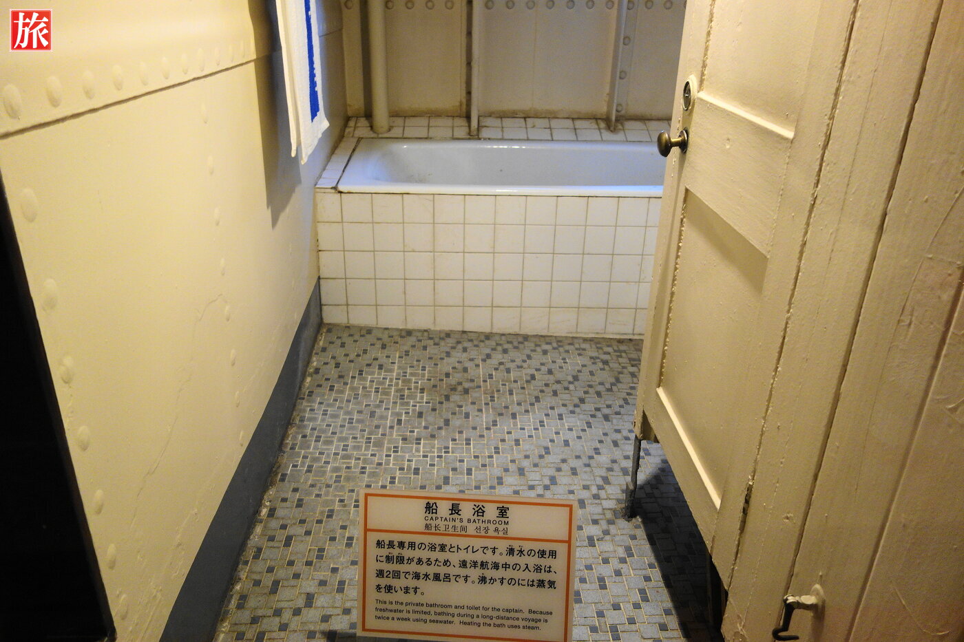 船長公室。船長の執務室で、停泊中は来客の応接にも利用されていました。船長室。船長浴室。沸かすのに蒸気を使い、海水を利用したそうです。入浴は週2回と説明にありました。