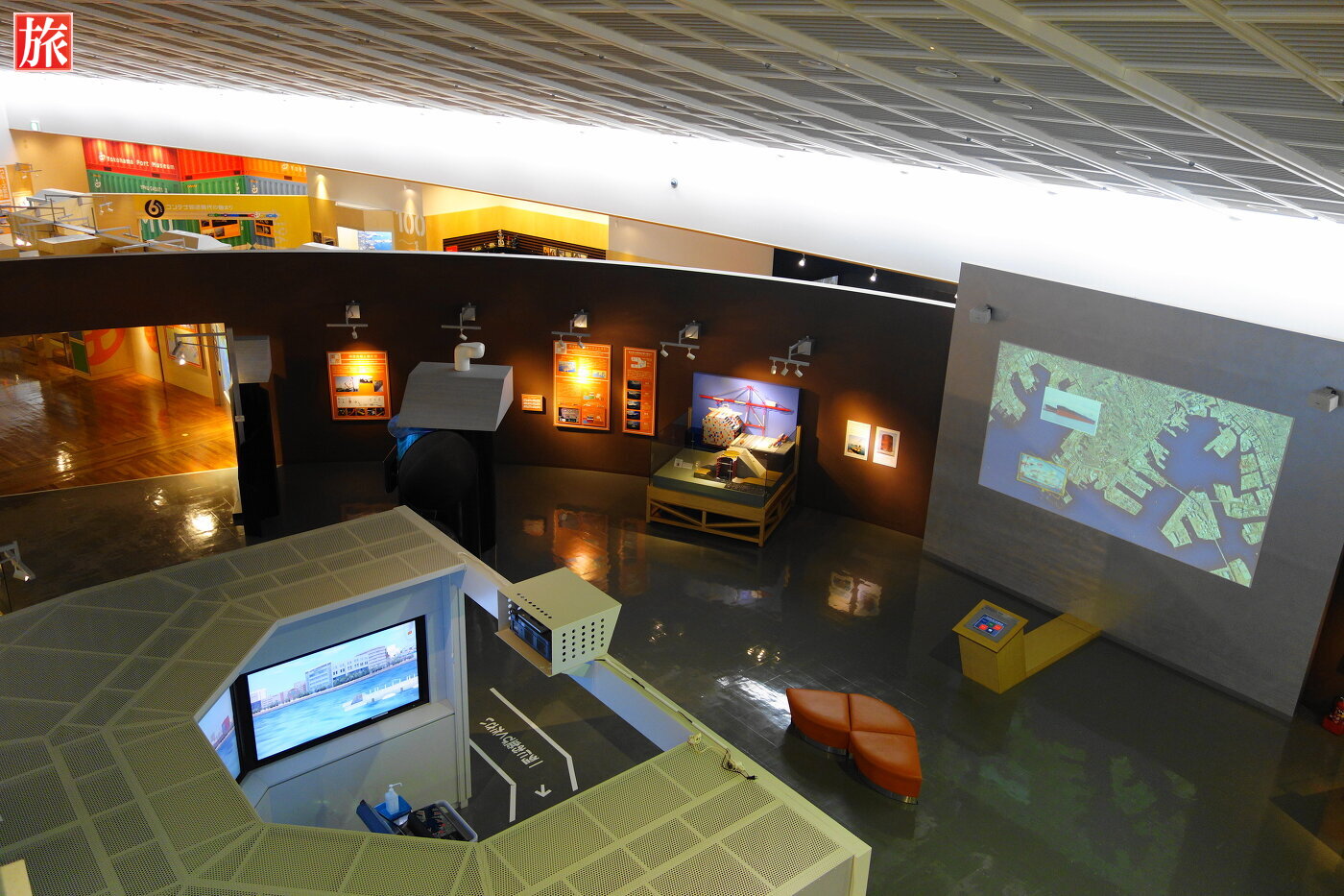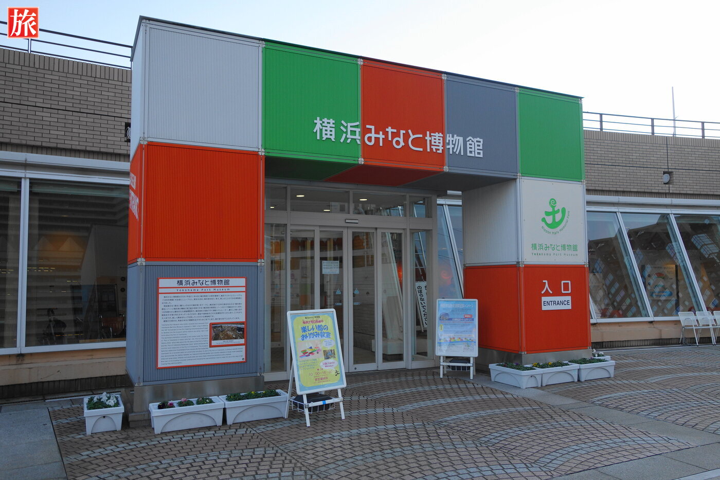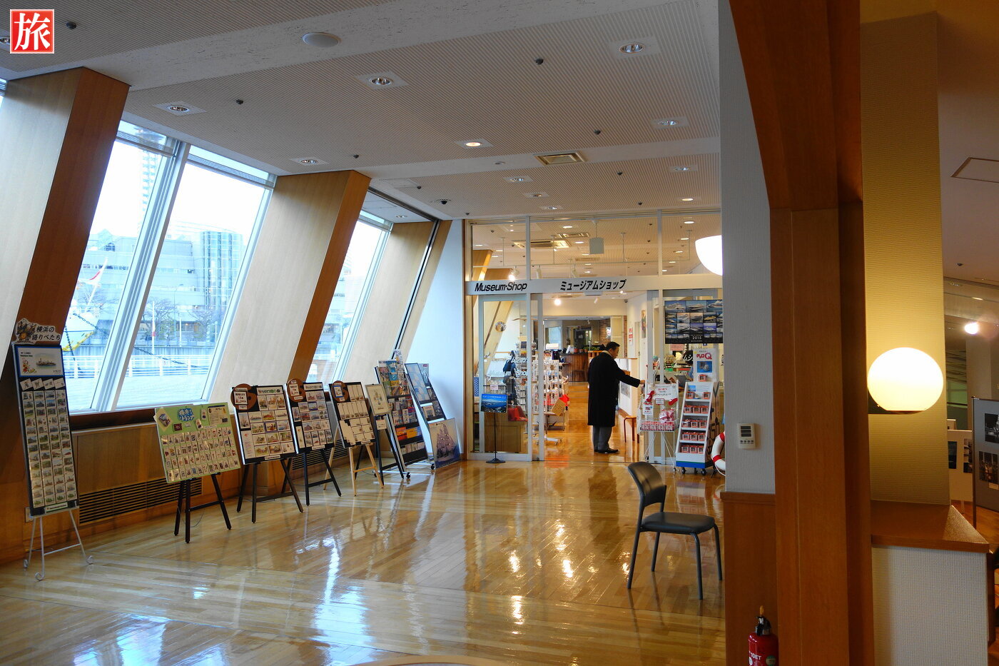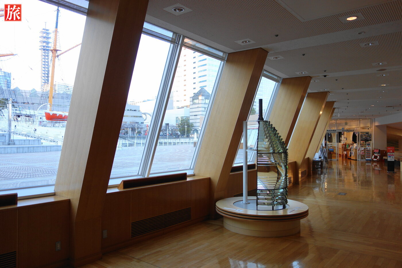 日本丸の甲板から見た横浜みなと博物館。横浜みなと博物館(旧 横浜マリタイムミュージアム)入口。内部1階フロアの様子。