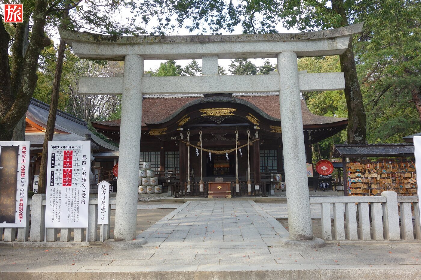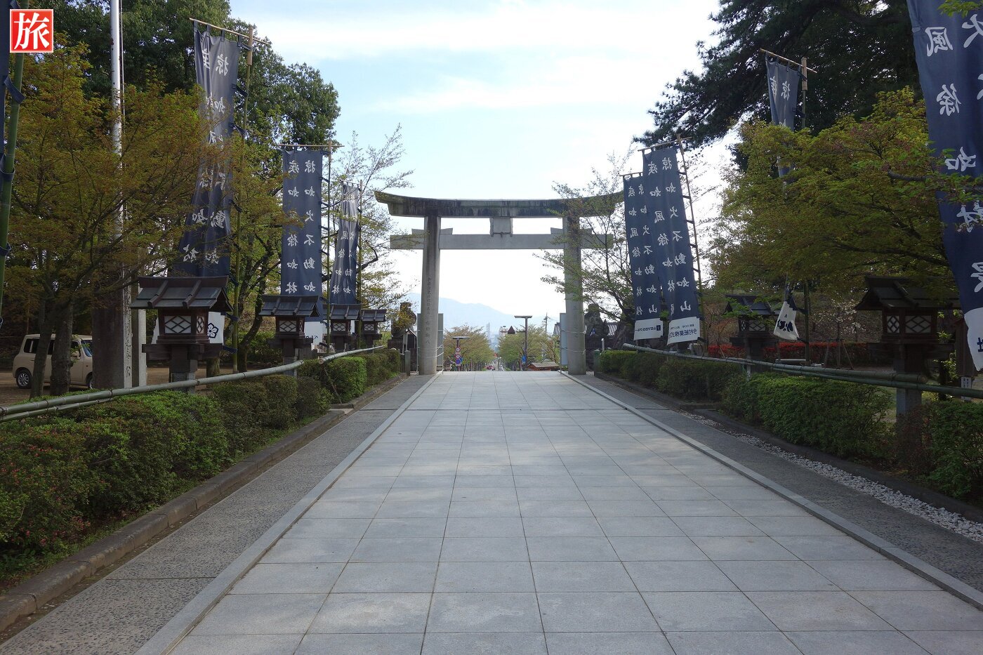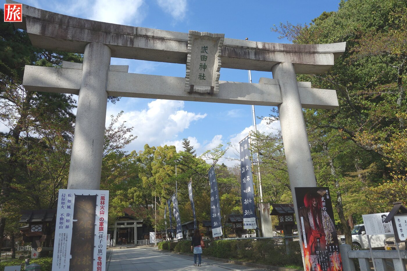 戦国時代、武田信虎・信玄・勝頼の三代が住んだつつじが崎館(武田氏館)の跡地に、1919年(大正8)に建立された神社。祭神は信玄で、境内には重厚な造りの社殿、武田家ゆかりの武具や資料を収めた宝物殿などがある。館跡(史跡)は土塁の外側に堀が巡らされ、中世の領主の館としては規模が大きい。春は桜が美しい。