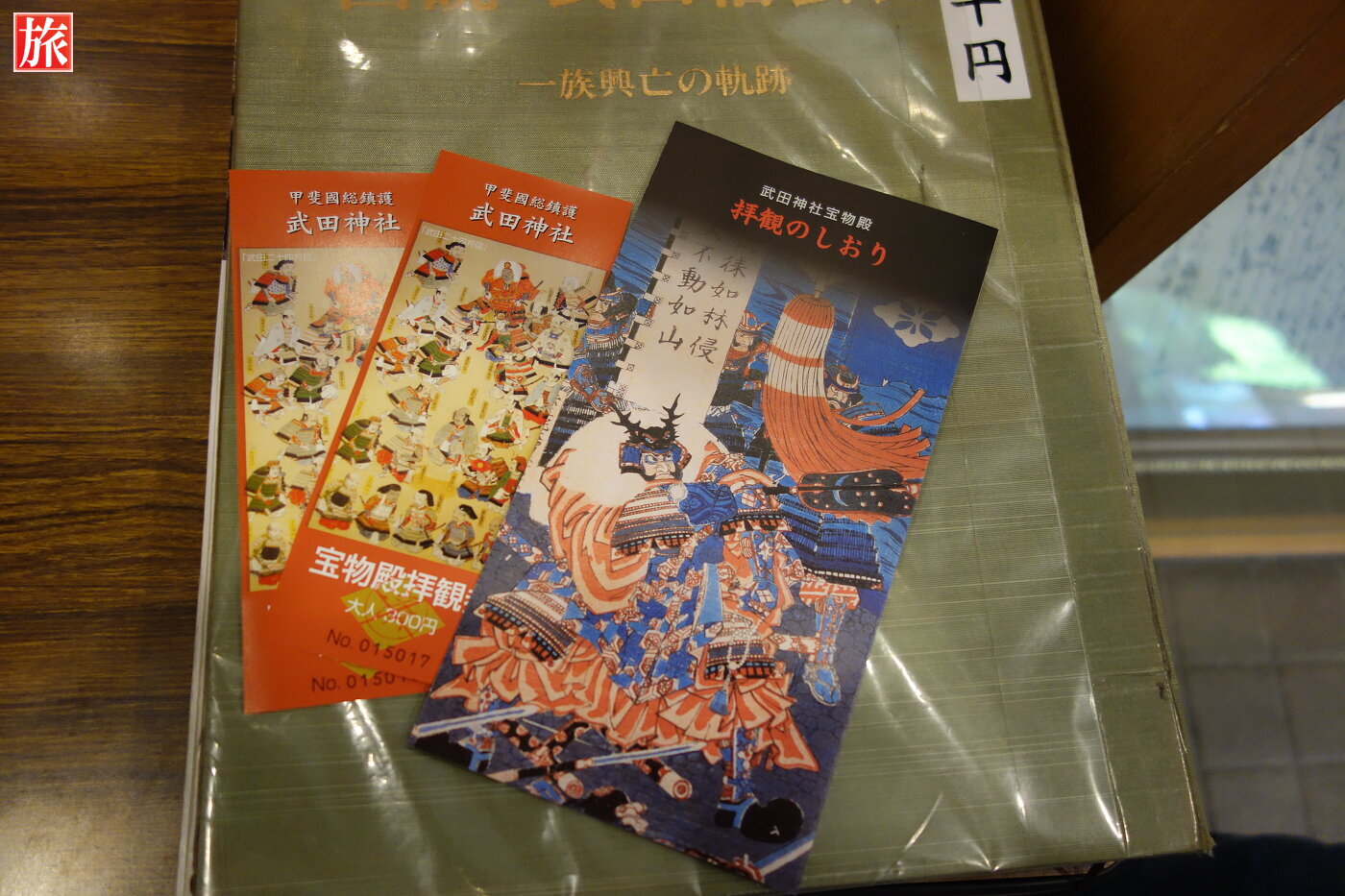 宝物殿拝観チケット(大人一人300円)。殿は撮影禁止でしたが「武田信玄公像」の前は記念撮影可能でした。