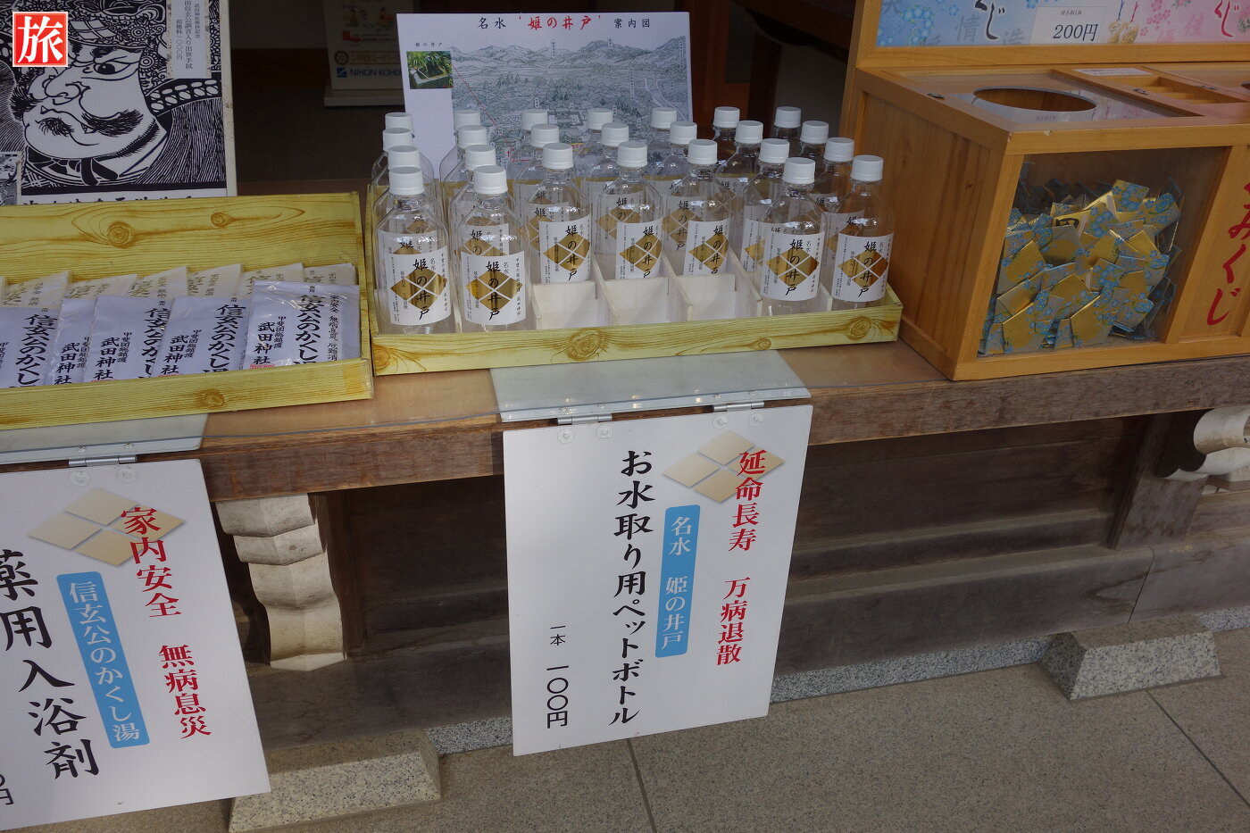 神符授与所。お水とり用ペットボトルが1本100円売っています。さっそく購入して名水「姫の井戸」へ向かいます。