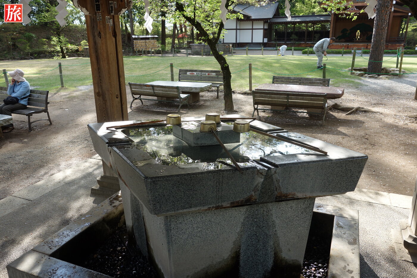 一之鳥居をくぐり参道を進みます。振り返って見た風景、その先は甲府駅に繋がっています。手水舎。水盤が家紋のひし形となっています。