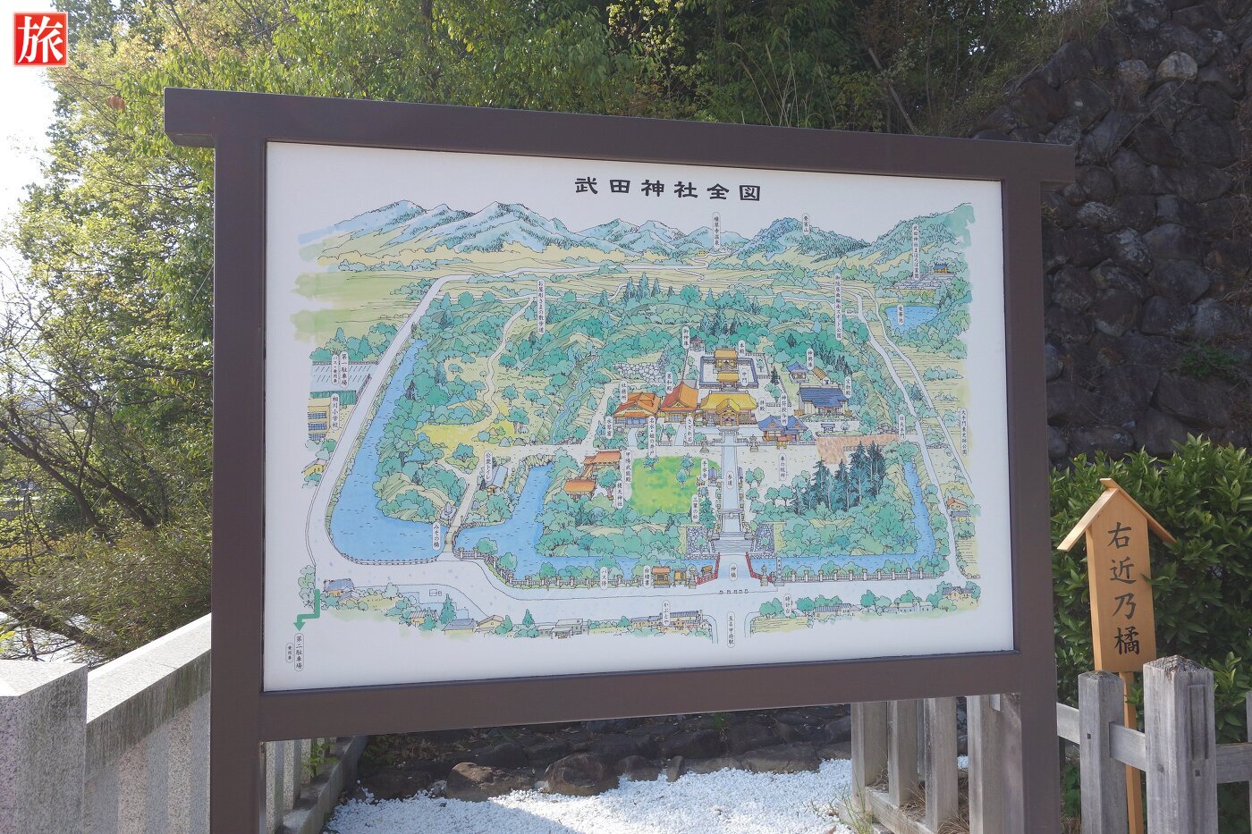 甲府駅から一直線上に武田神社はありました。朱色の神橋を渡り参道入口へ。武田神社全体図の看板。