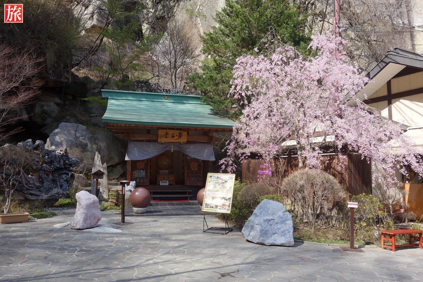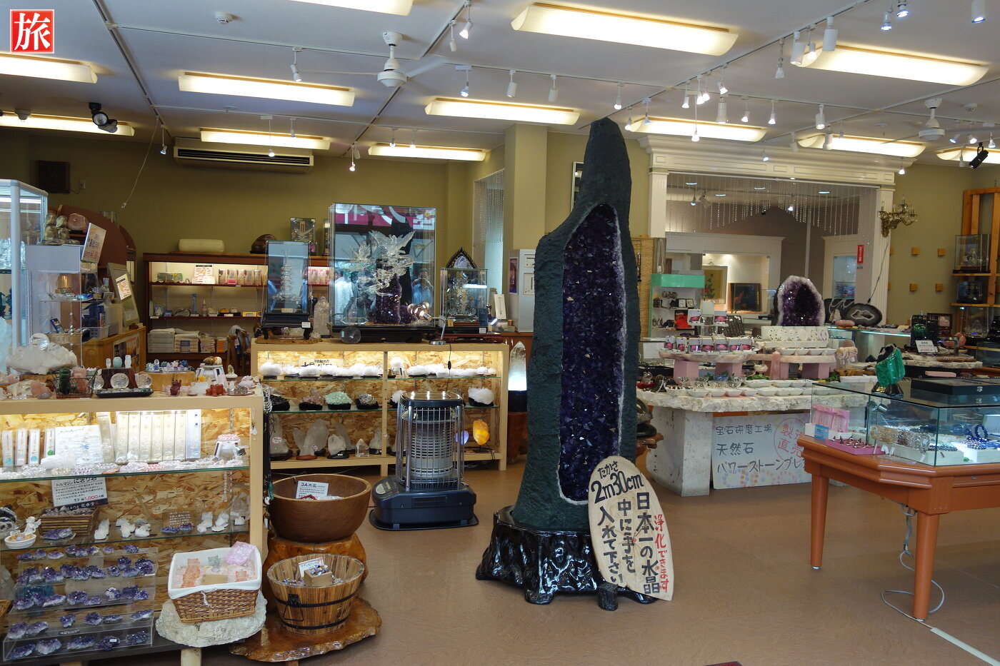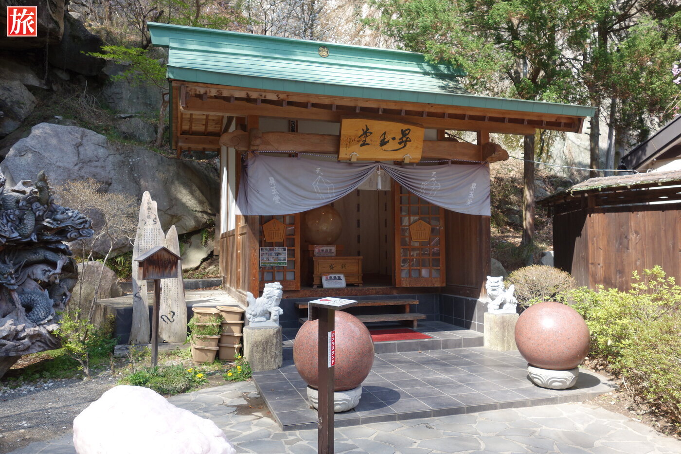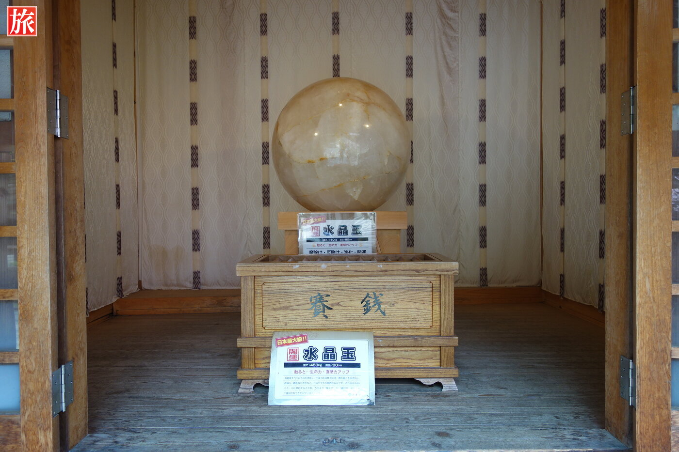 お土産店を抜けた右手に昇玉堂がありました。お堂には巨大な水晶玉が祀らています。この巨大な水晶玉は直径80cm・450キロで、日本一大きな水晶だそうです。さわると生命力・直感力アップや魔除け、浄化、開運、商売繁盛などさまざまなパワーを授かれると書いてありました。