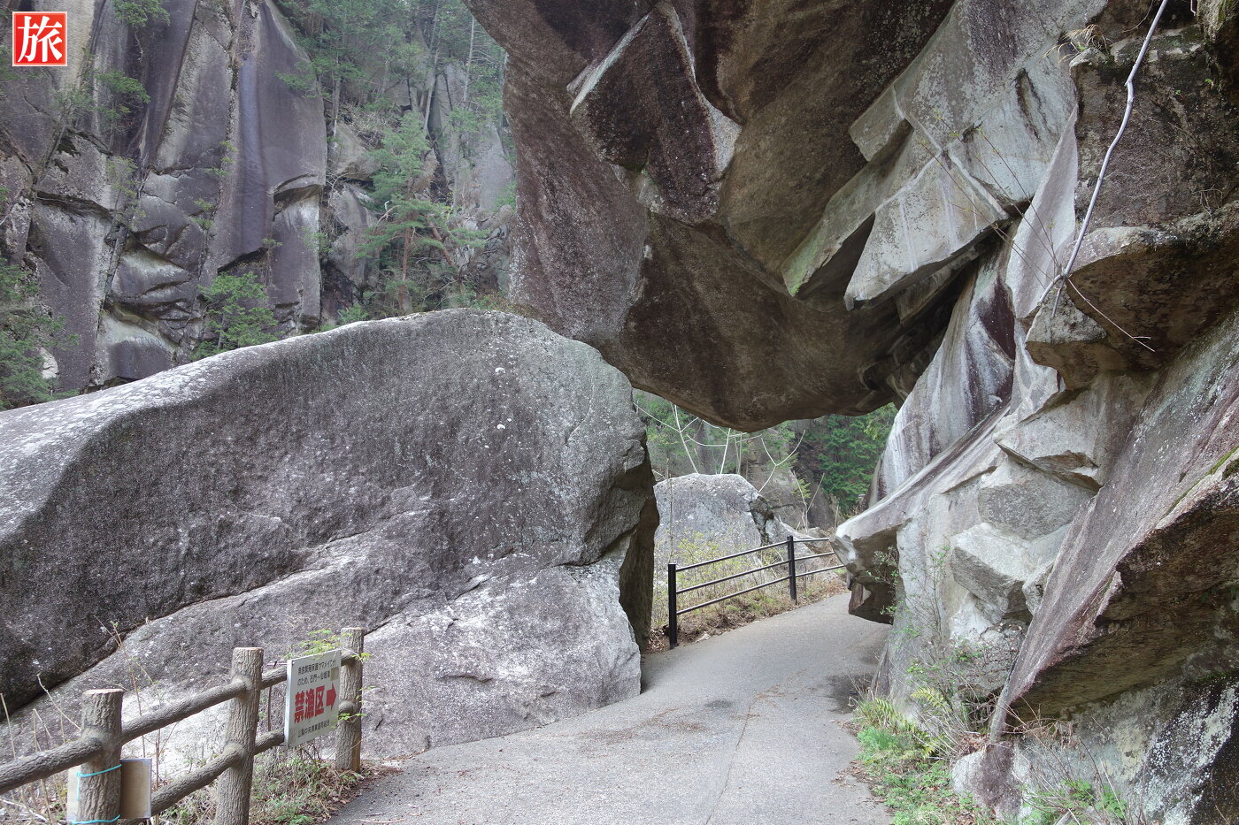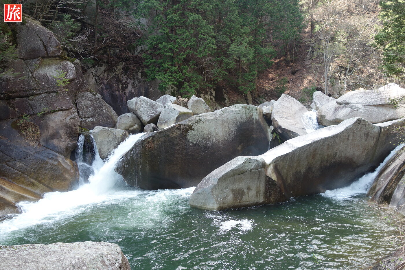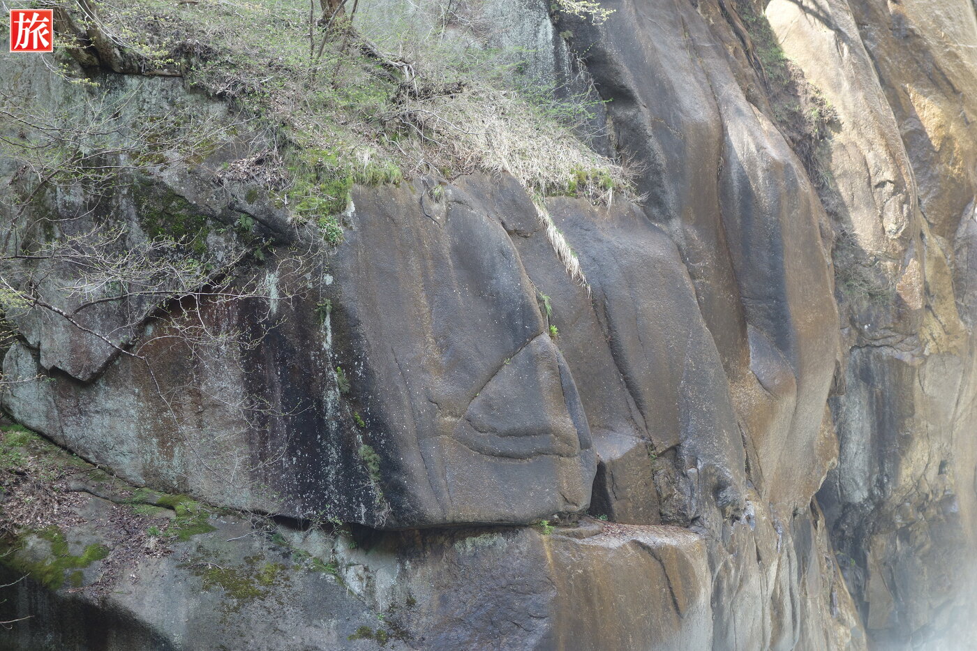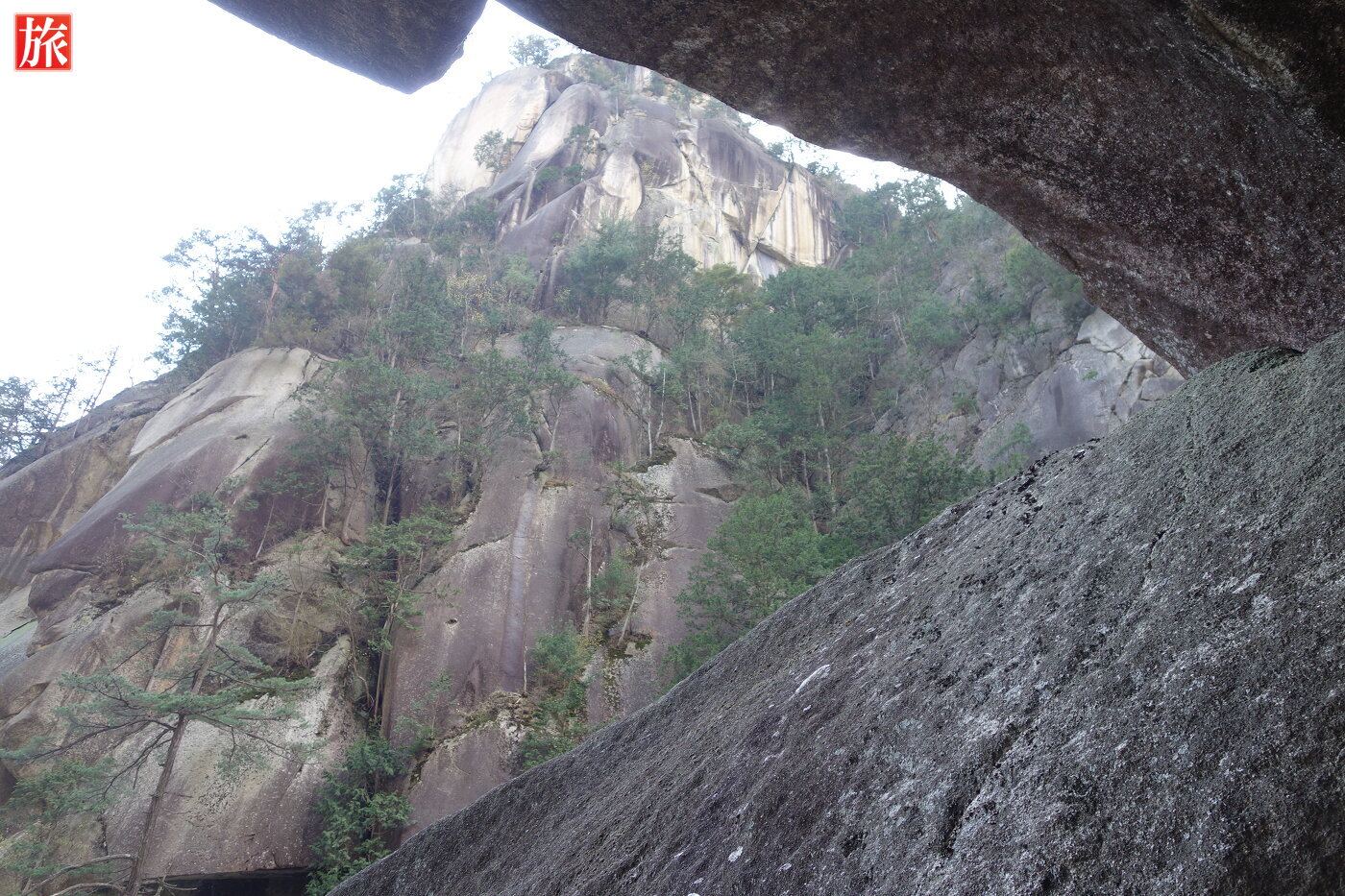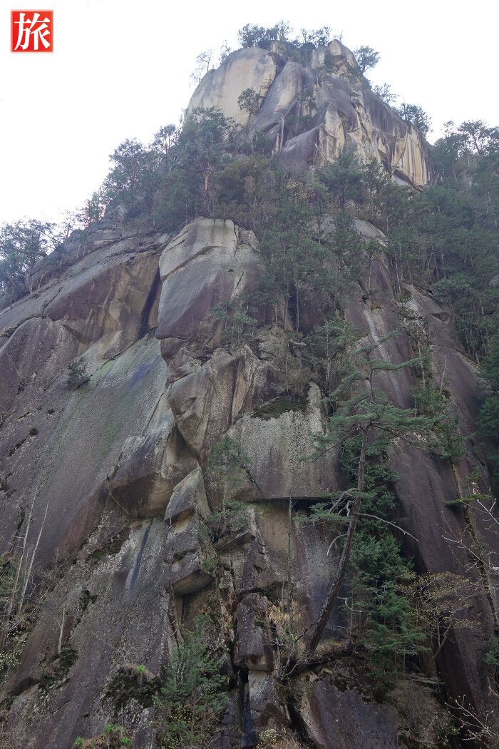 少し下流に下ると巨大な花崗岩に囲まれた「石門」が現れます。先端がわずかに離れ今にもくっきそう・・石門付近から岩肌を見た風景。