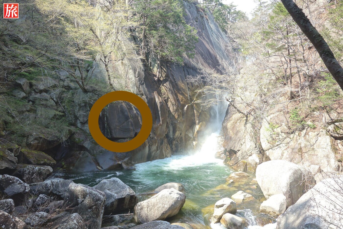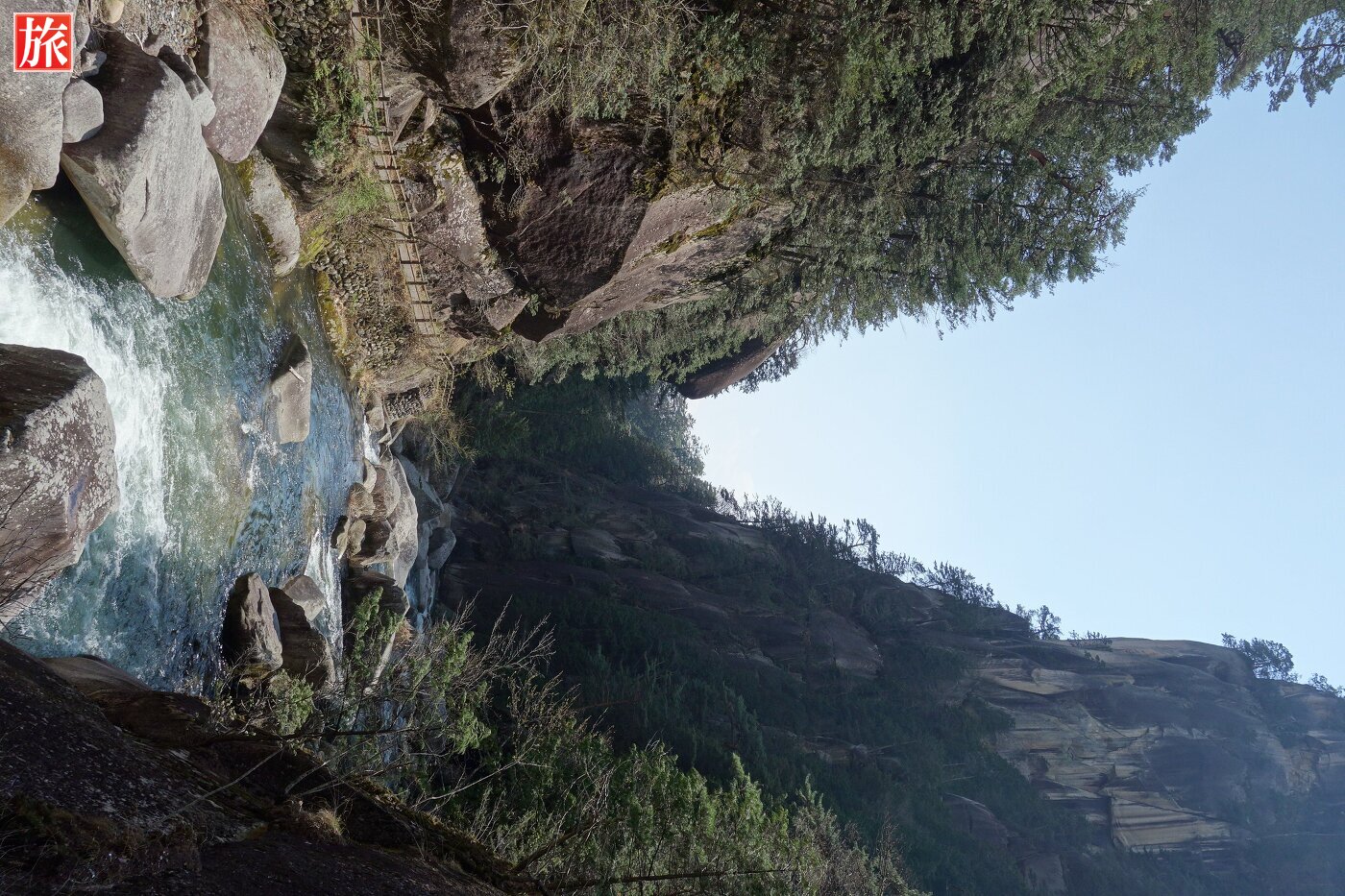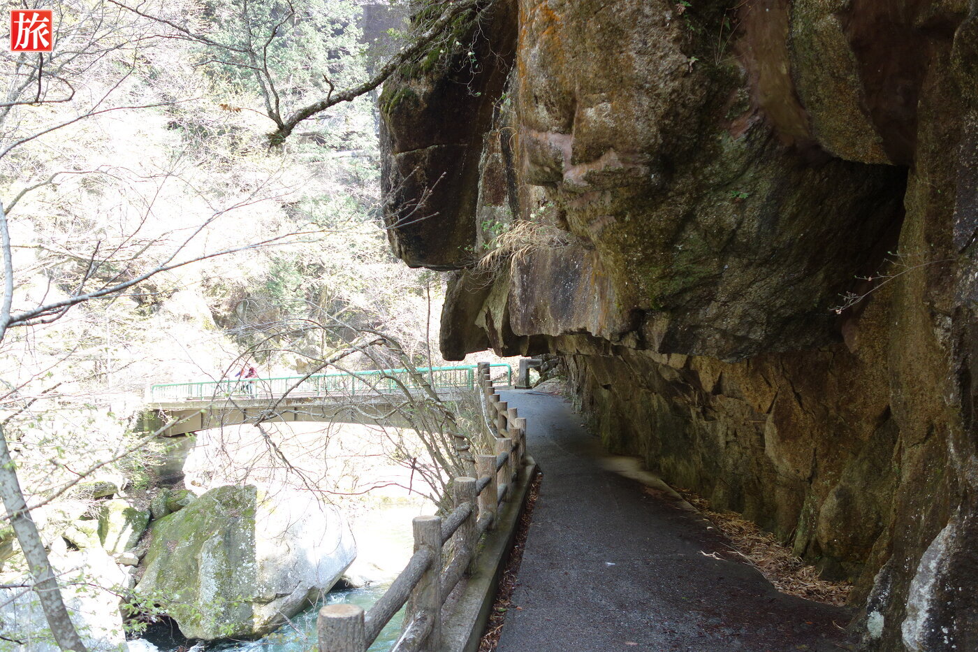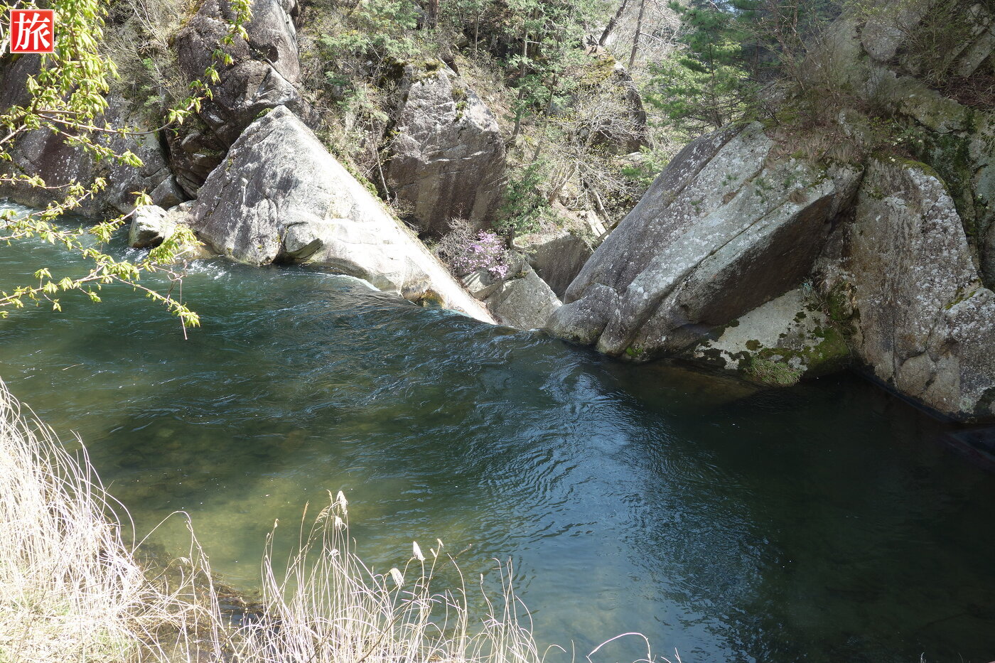 少し下流に下ると巨大な花崗岩に囲まれた「石門」が現れます。先端がわずかに離れ今にもくっきそう・・石門付近から岩肌を見た風景。