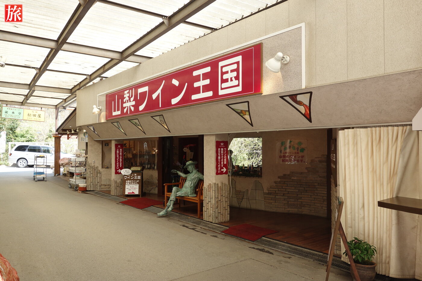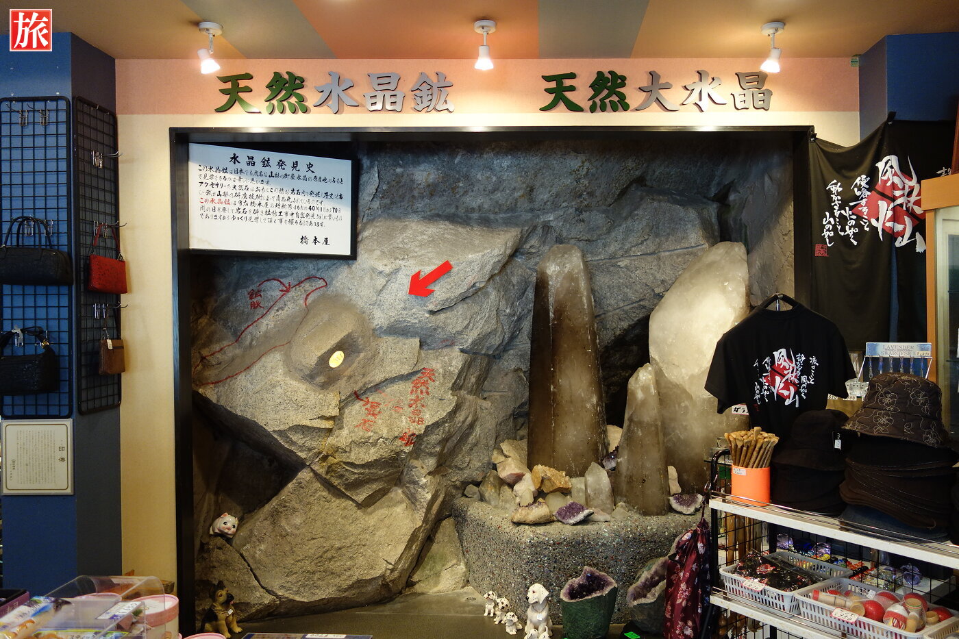 仙娥滝に向かう途中にあった「たかさ日本一の水晶」。山梨ワイン王国店内からは滝壷に落ちる前の荒川が見れます。