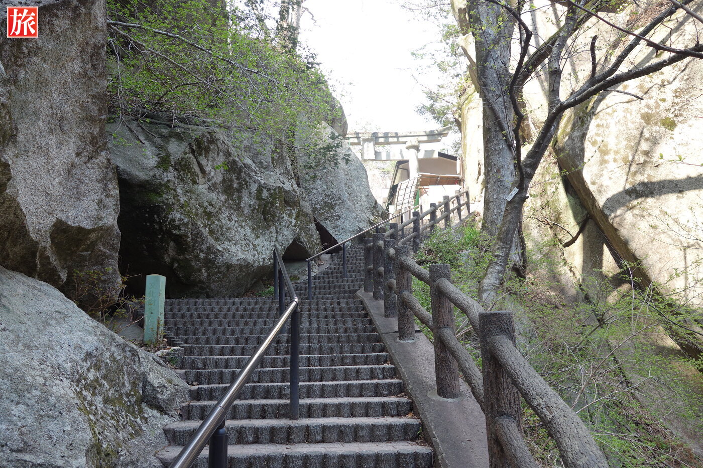 この金櫻神社の鳥居の下に仙娥滝はあります。階段を降りていきます。地殻の断層によってできた滝は高さ30mあり豪快!