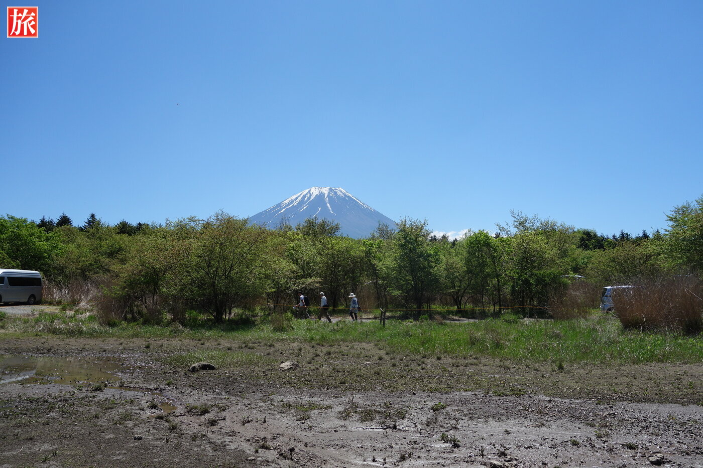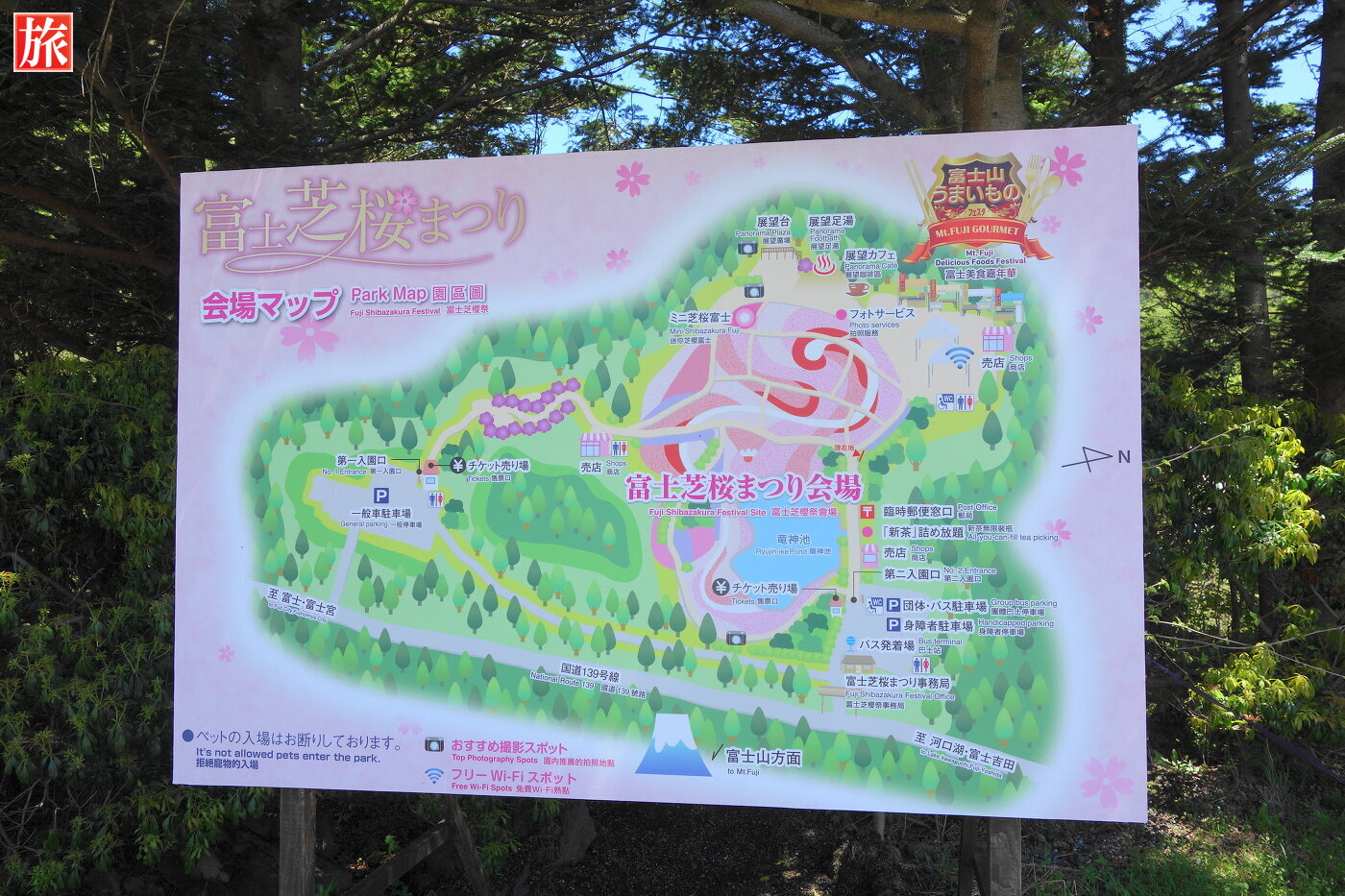 竜神池と正面に富士山。会場マップ。本栖湖に棲んだ龍が、お山の噴火を報せ、村人を救ったと云わる竜神池。