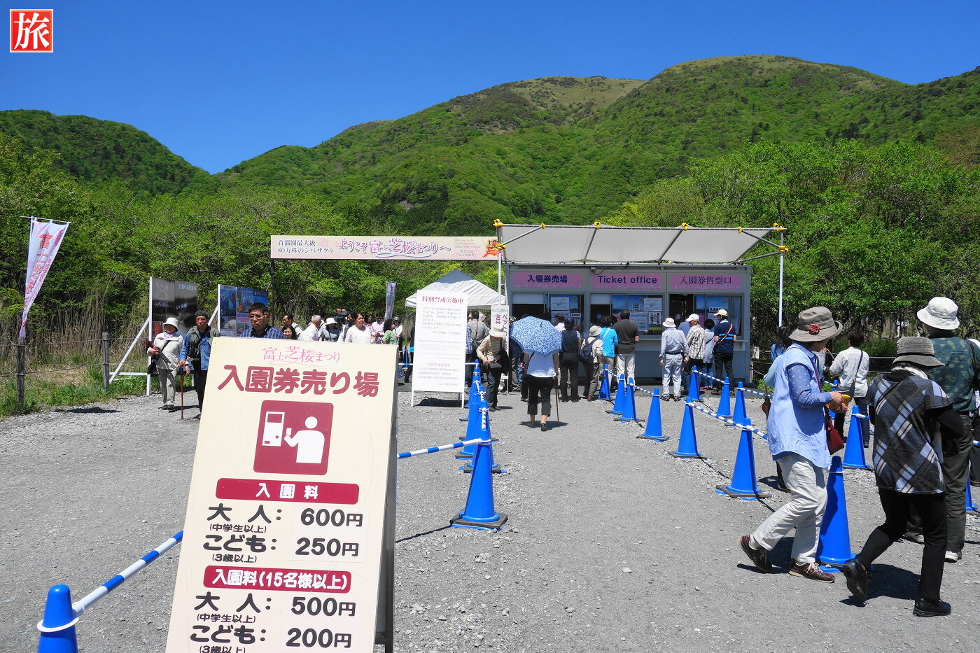 臨時駐車場(有料普通車 500円)から見た富士山!入場券売り場。本日の入場料金は大人一人600円。富士芝桜まつり会場まではここから10分くらい歩きます