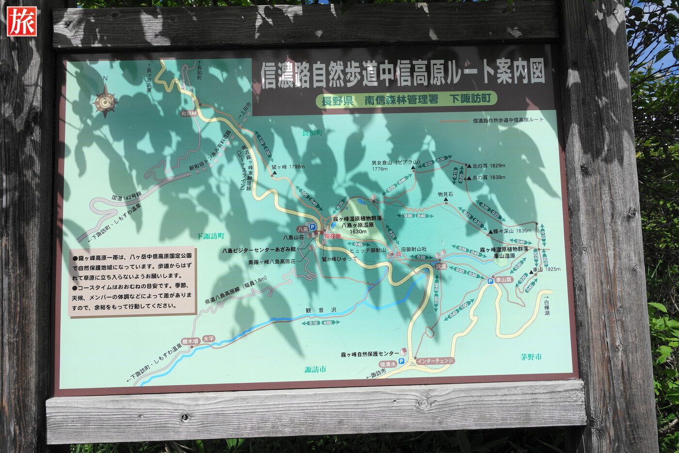 霧ケ峰湿原植物群落記念石碑。信濃路自然歩道中信高原ルート案内図。道標。