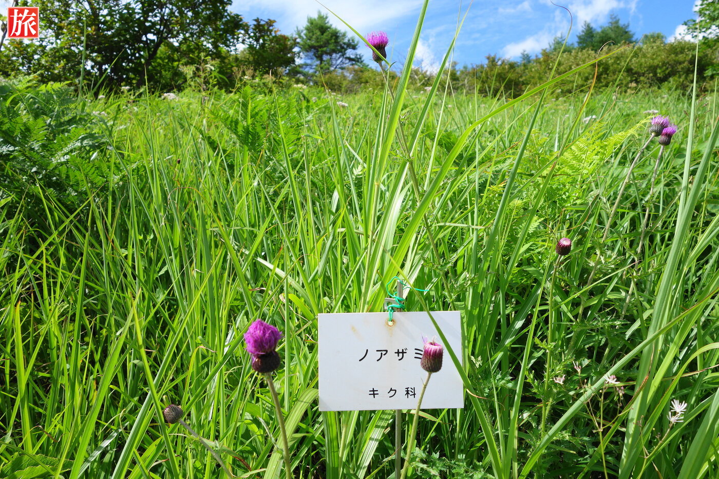 木道の階段を下るとすぐ目の前が湿原となります。木道の遊歩道が整備されています。正面には車山が見えます。ノアザミが咲いていました。