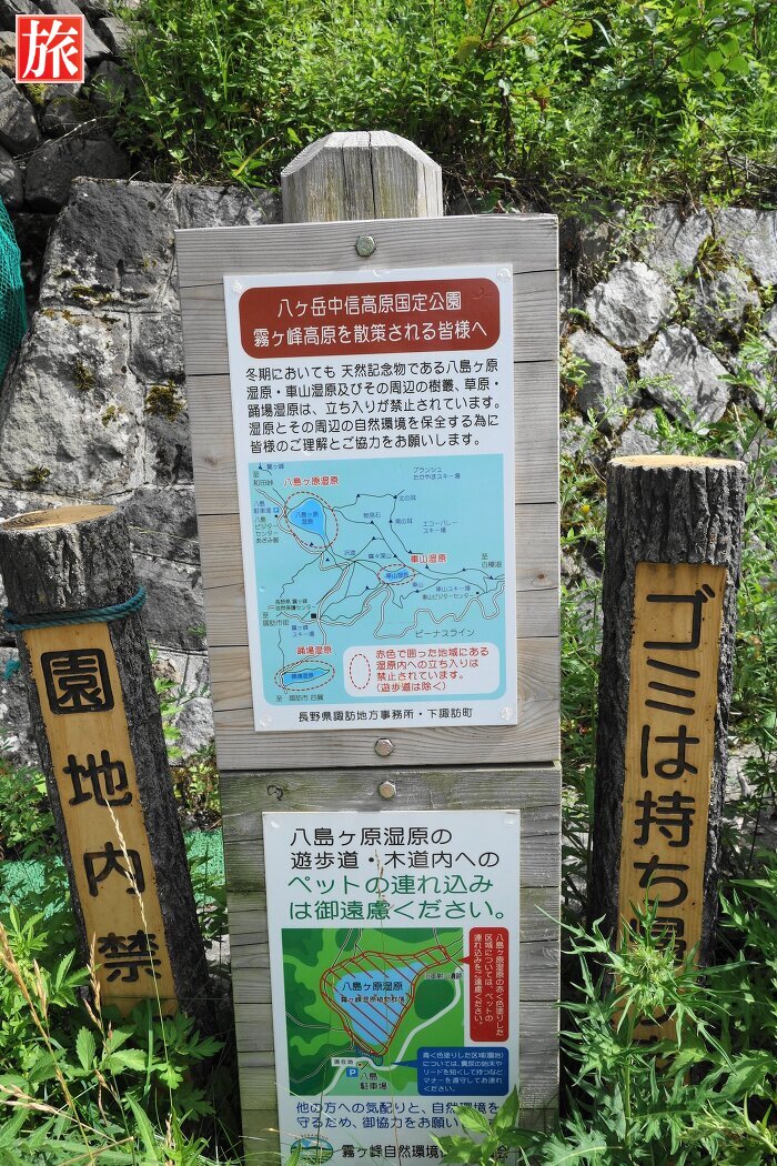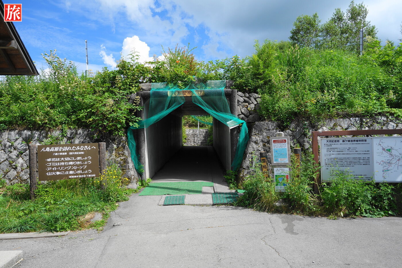 八島ヶ原湿原入口です。トンネルを潜ります。入口にあった霧ケ峰湿原植物群落の説明。散策の注意書き。