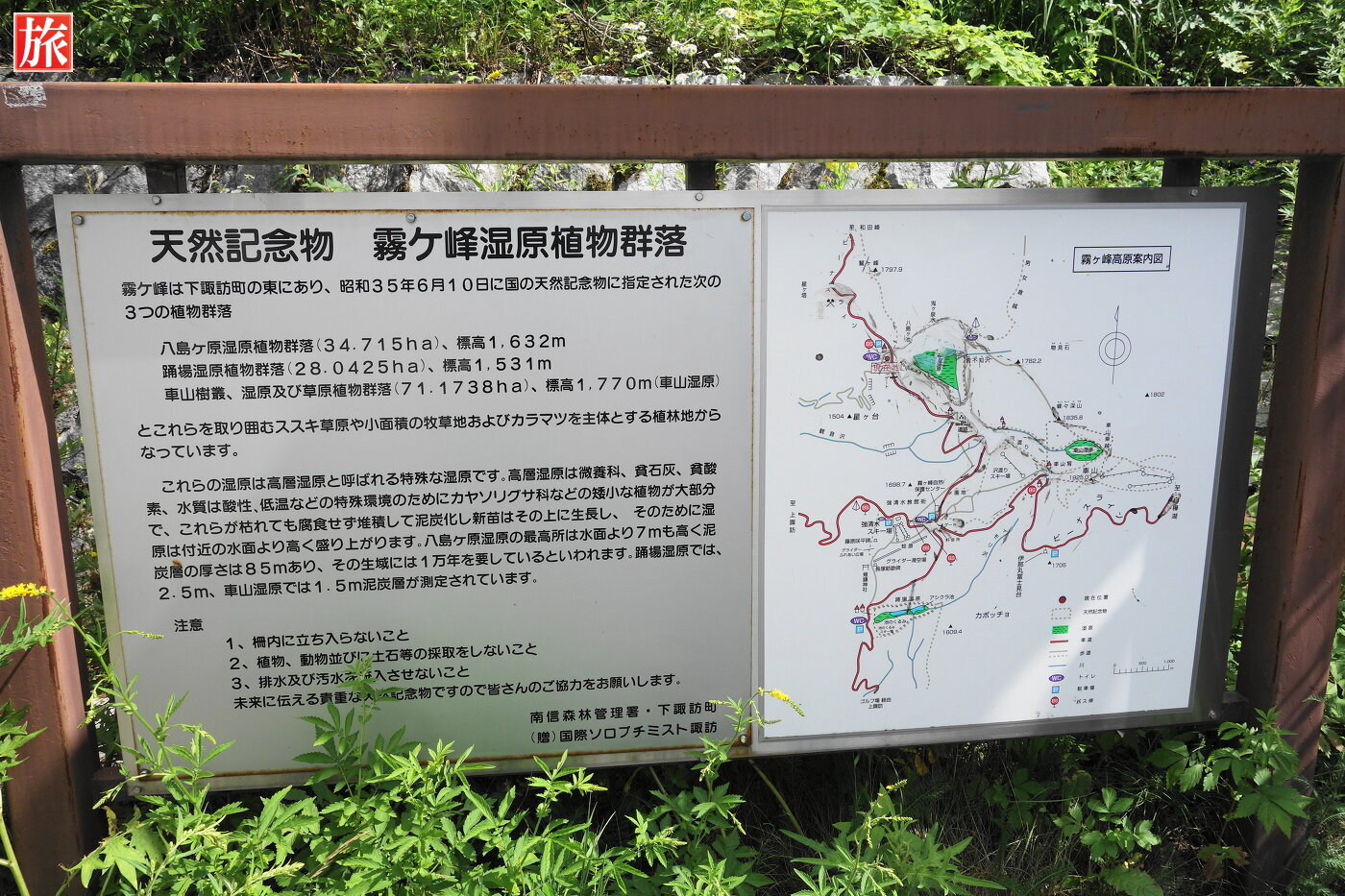 霧ケ峰火山郡によって形成された溶岩台地上の高層湿原。日本の高層湿原の南限にあたり、湿原の泥炭層は世界でも有数の厚みをもつとされ、泥炭層は厚いところで8.05mにもなっています。泥炭層の推定形成速度は年間平均0.7mm、約1万2千年をかけて形成されたといわれ、国の天然記念物にも指定されています。湿原1周は約90分の散策コースとして遊歩道も整備されています。