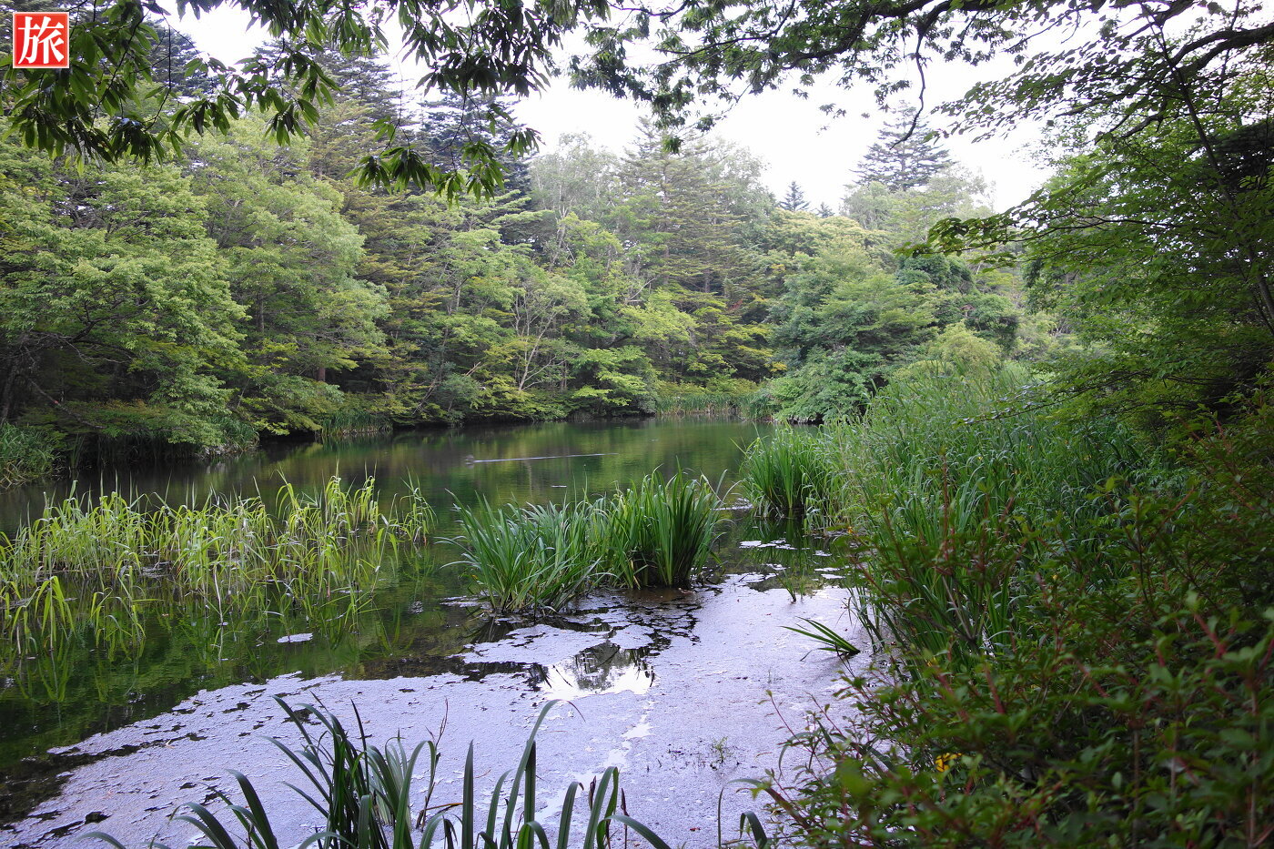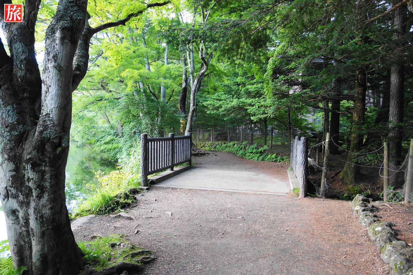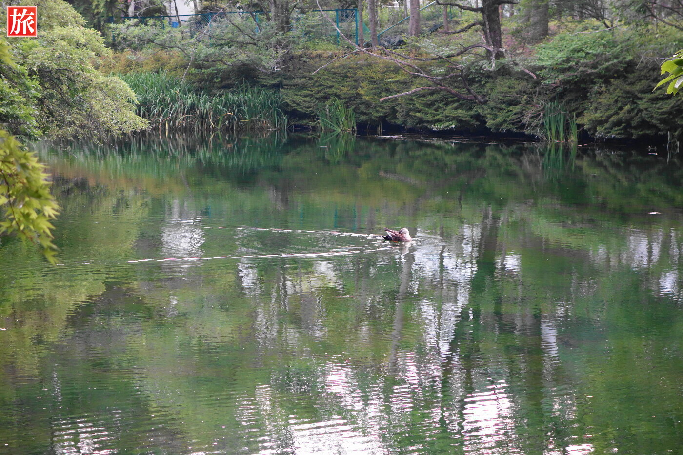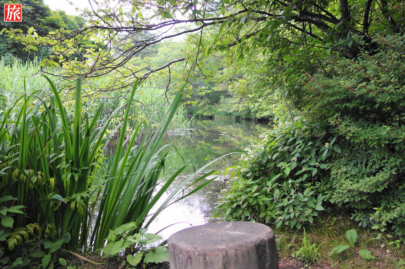 西側の遊歩道から見た雲場池の風景。浮島もありました。西側の遊歩道の様子。
