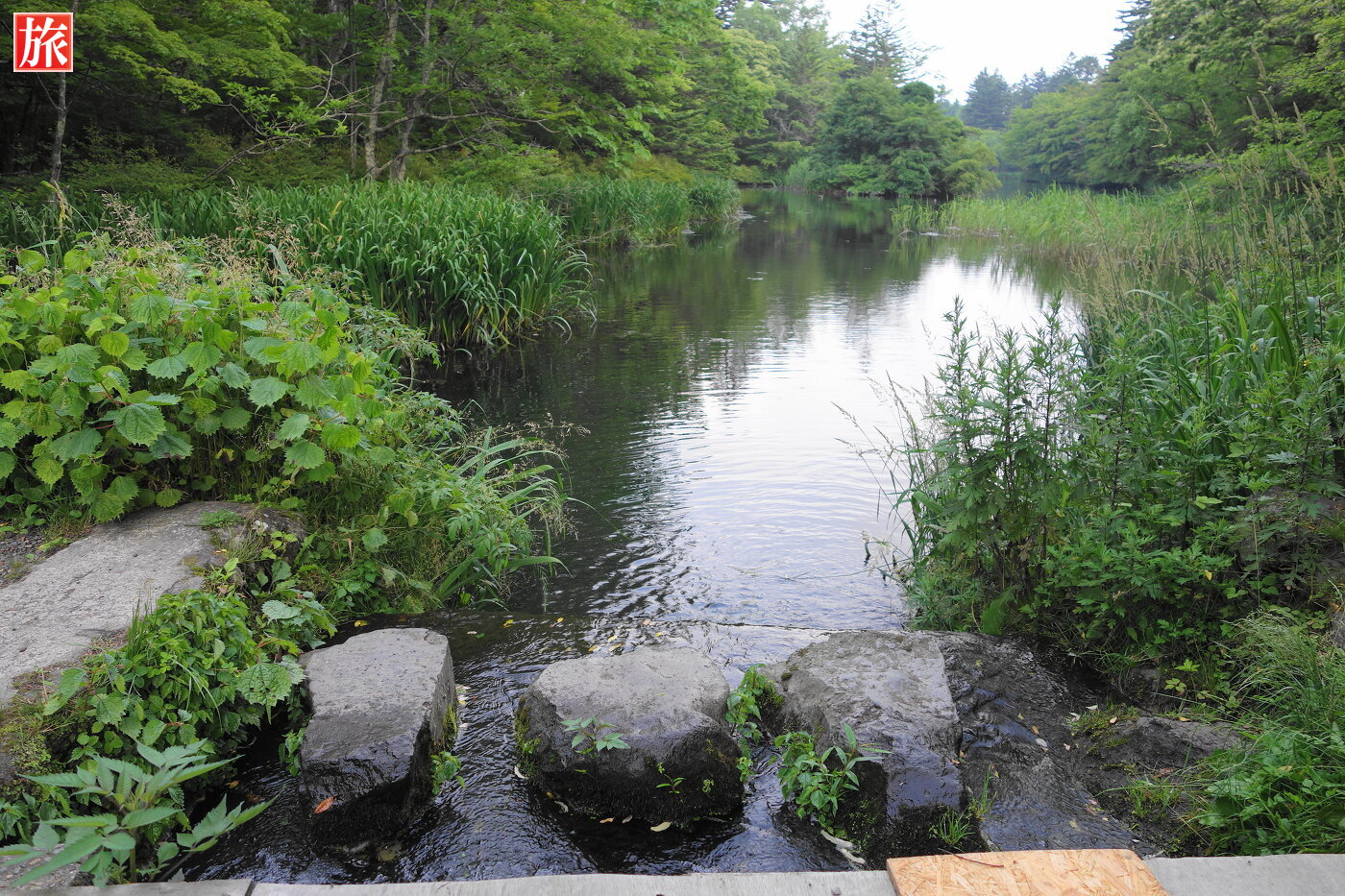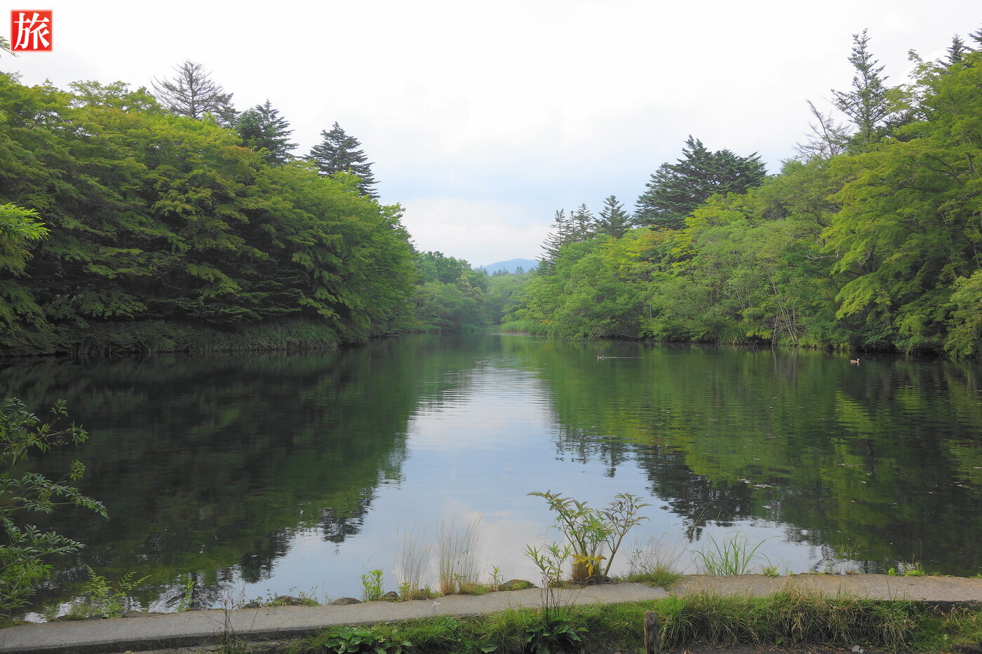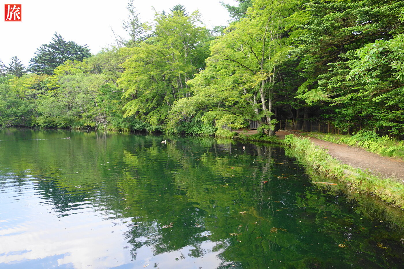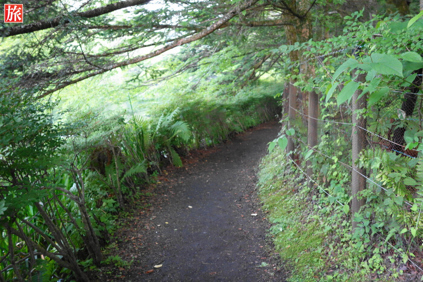 西側の遊歩道から見た雲場池の風景。浮島もありました。西側の遊歩道の様子。