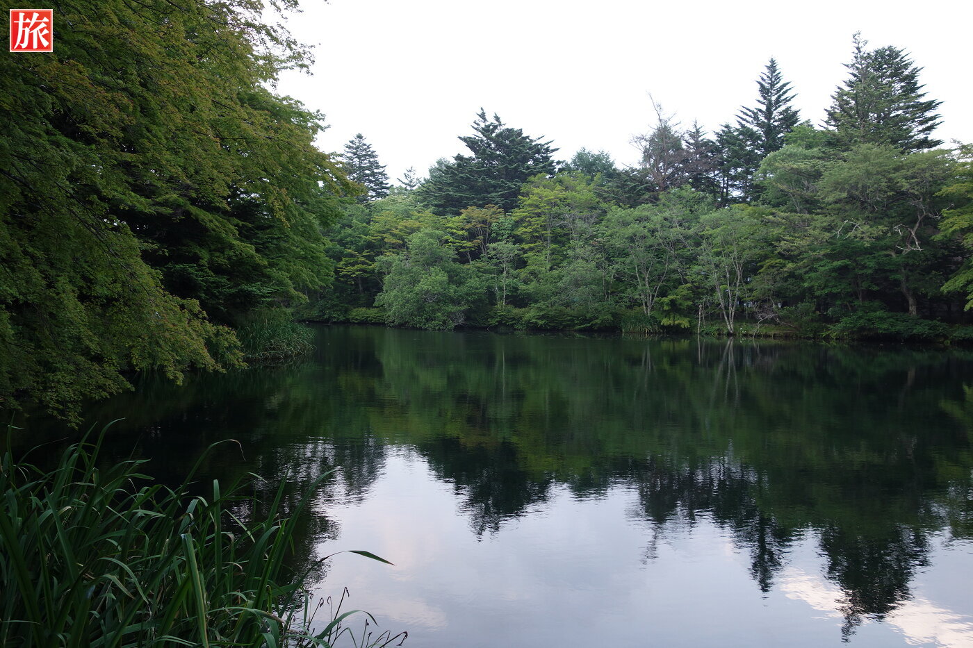 右手(東側)遊歩道入り口。遊歩道から見た雲場池の景色。こちら側(東側)「遊歩道」の池に面して生える木々は低く池面がよく見えます。