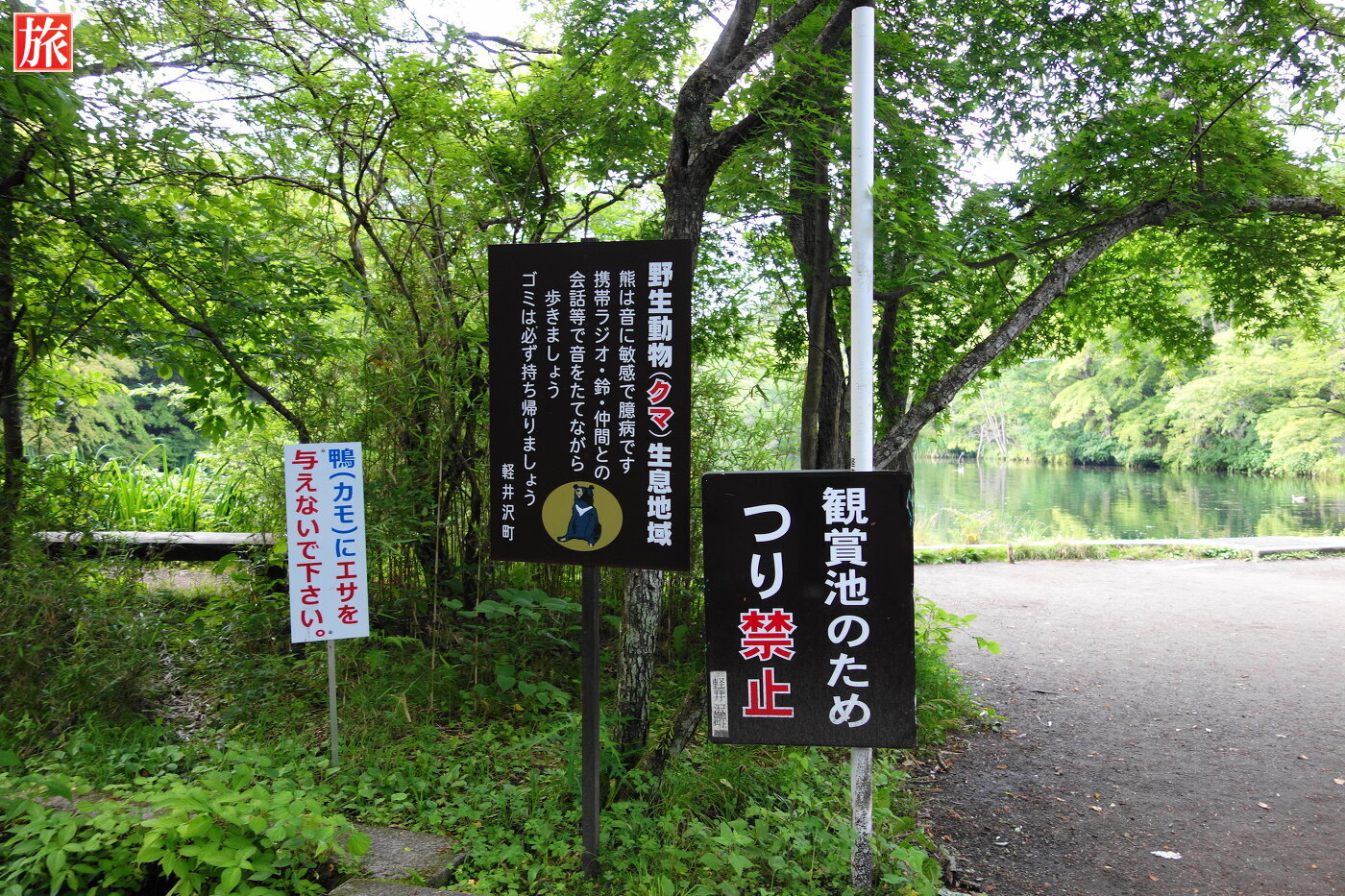 雲場池の南側入り口付近に駐車場の案内図がありました。雲場池の解説板。クマ注意の看板とつり禁止の看板。