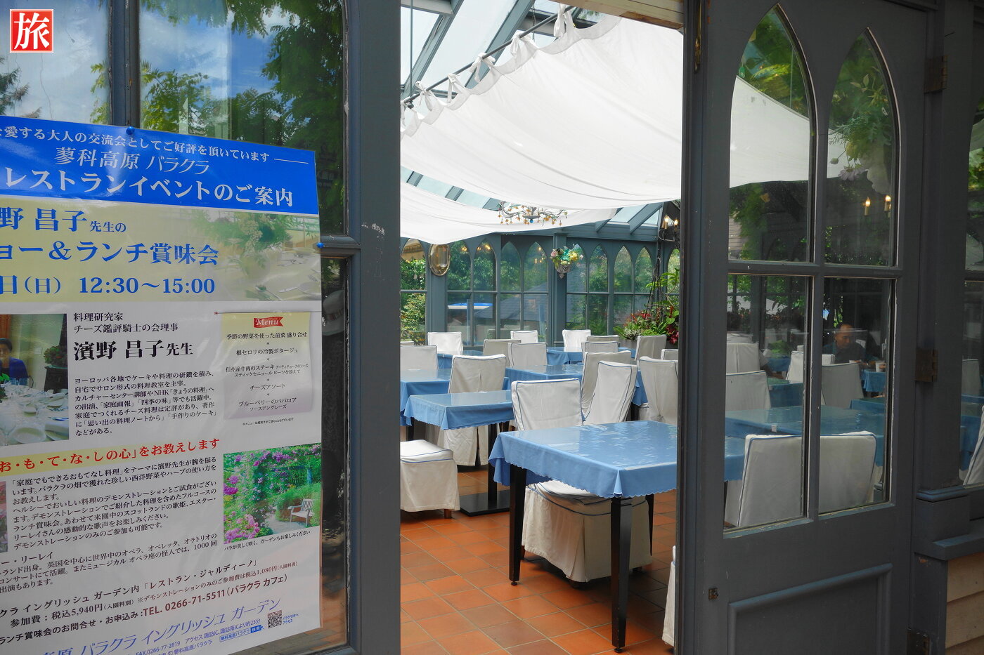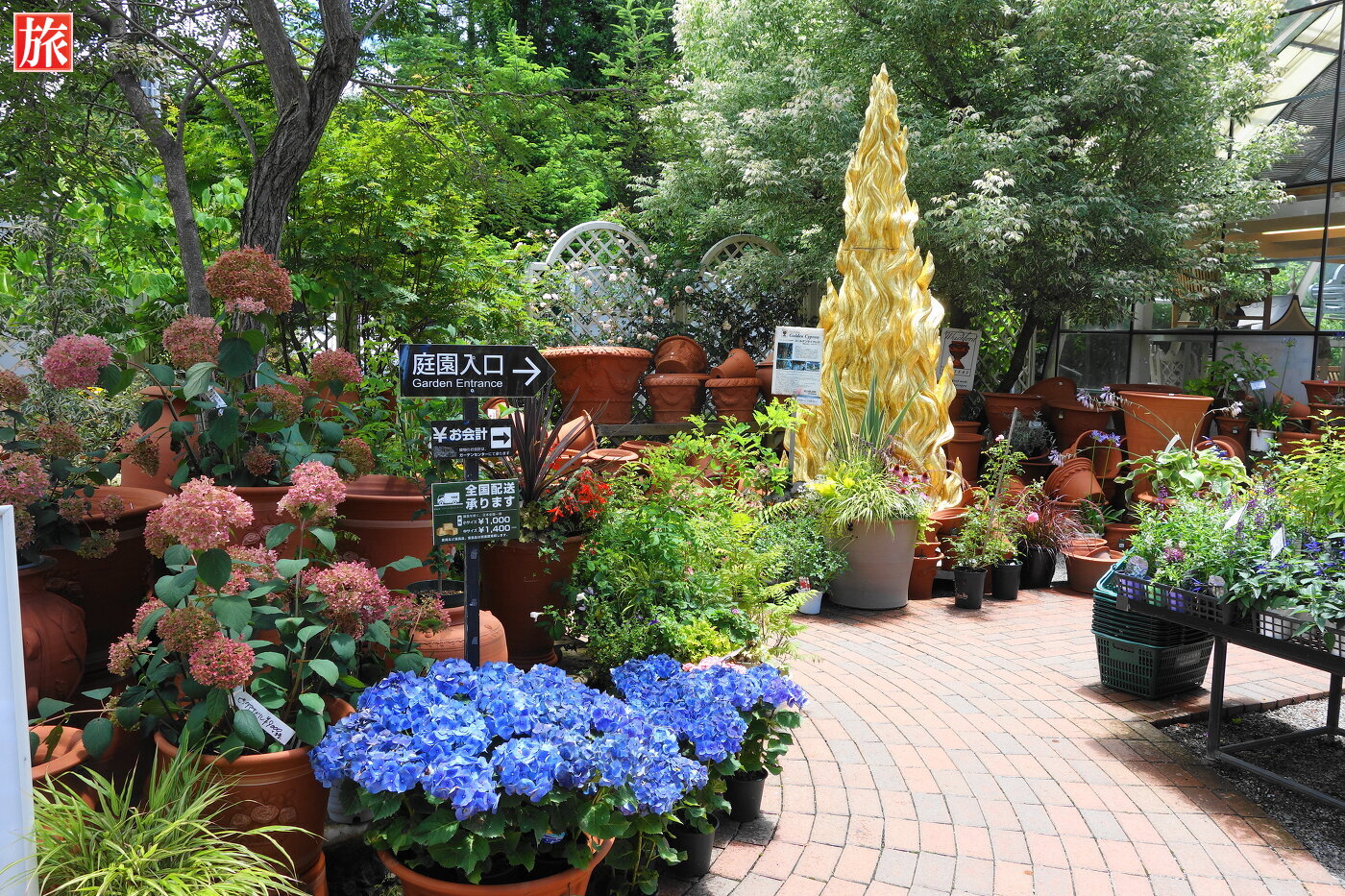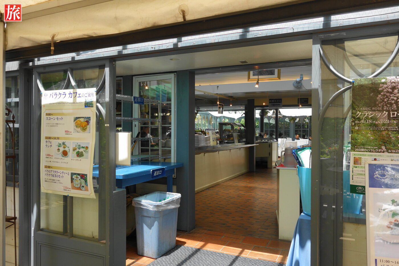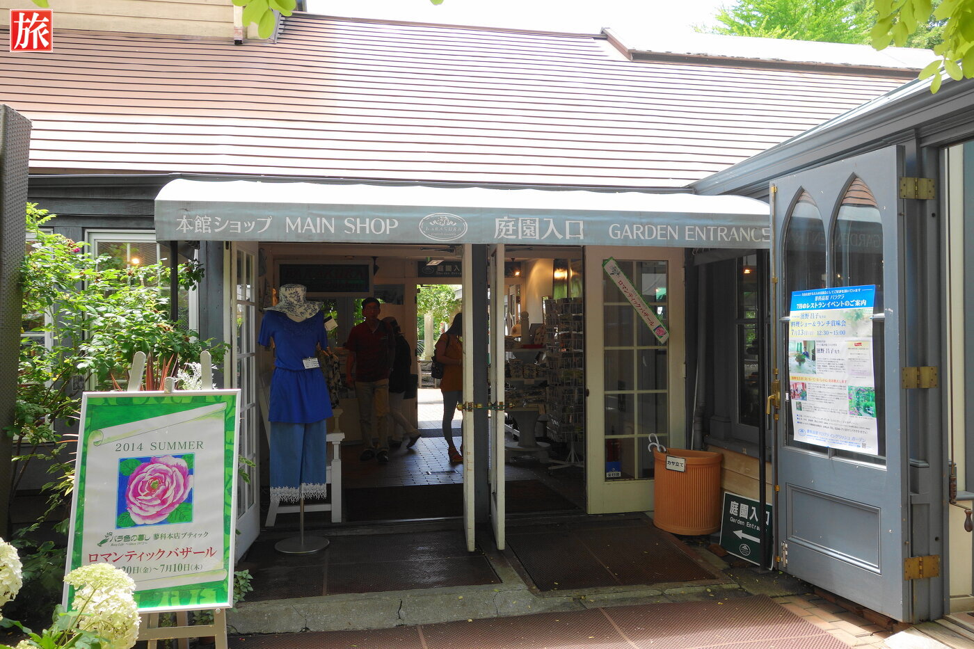 ガーデンセンターと本店ブティク繋がっている門。バラクラカフェ店内の様子。バラクラカフェ入り口。本店ショップ・庭園入り口