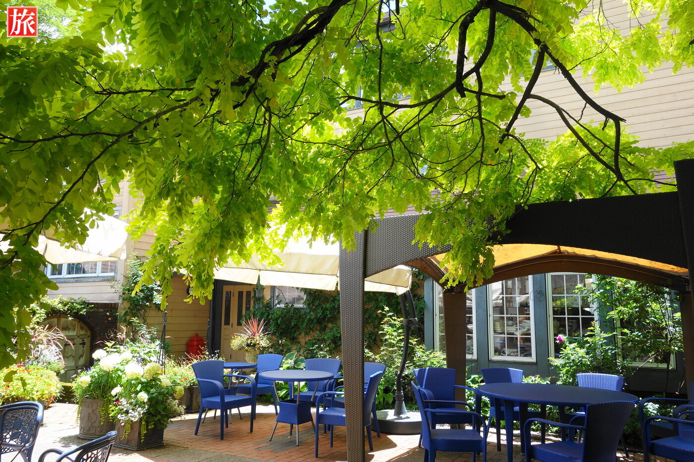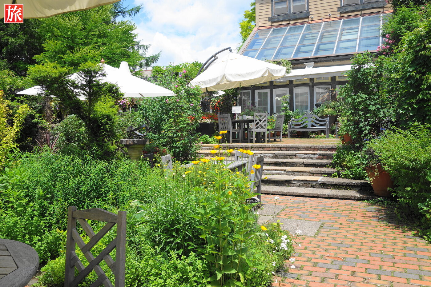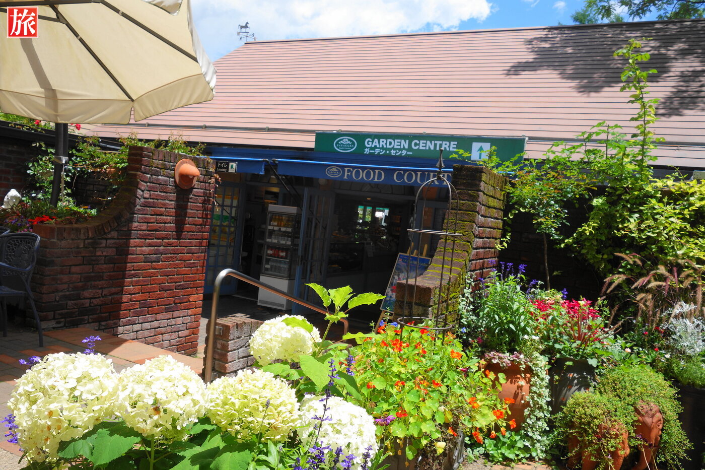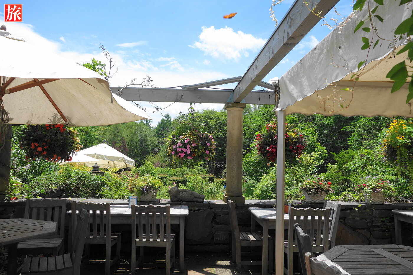 青空が気持ちいい!庭園入り口付近の風景。テラス席付近の風景。
