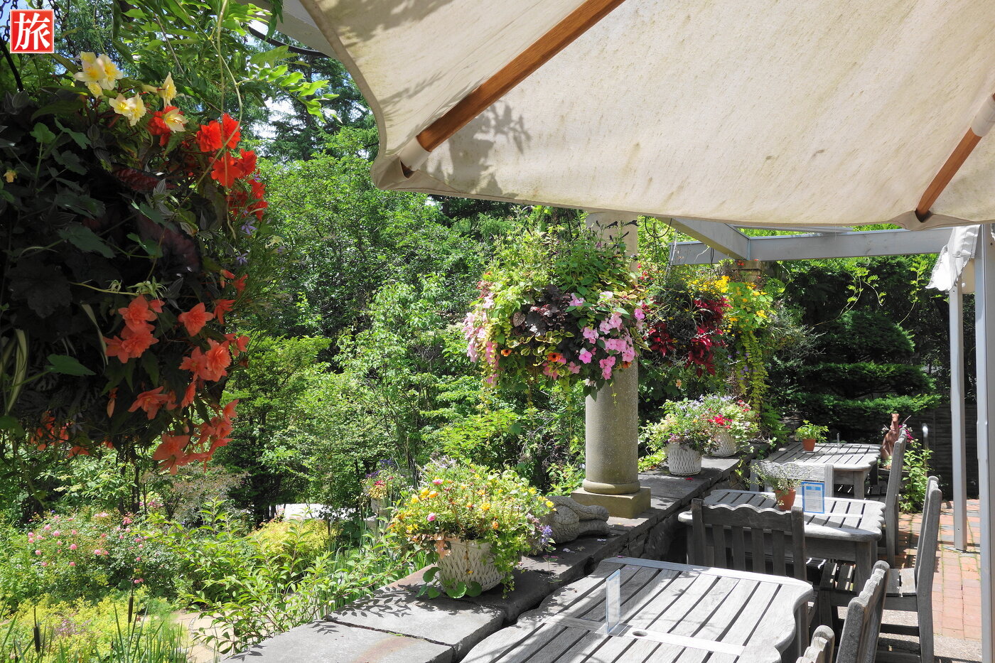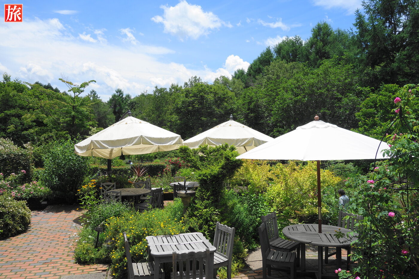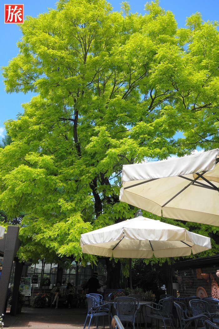 青空が気持ちいい!庭園入り口付近の風景。テラス席付近の風景。