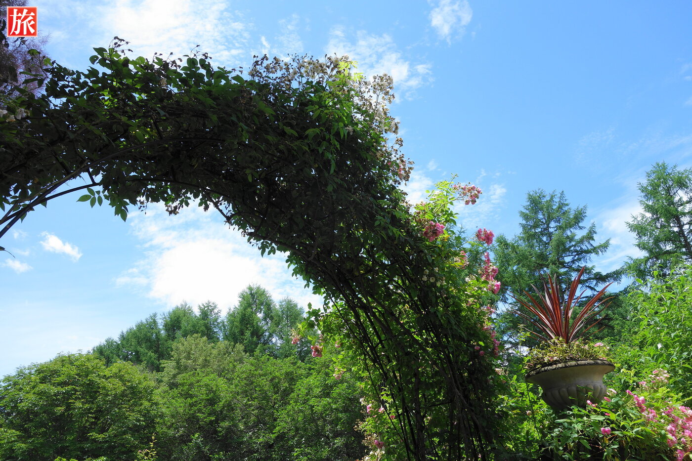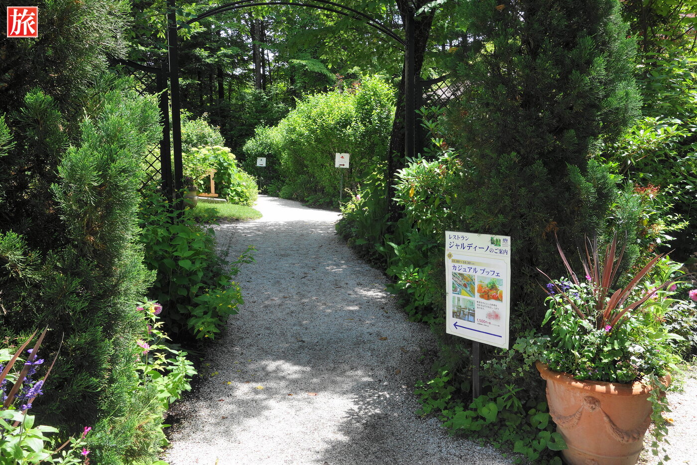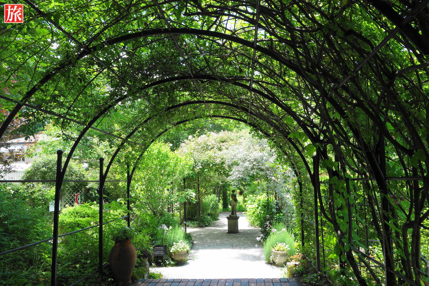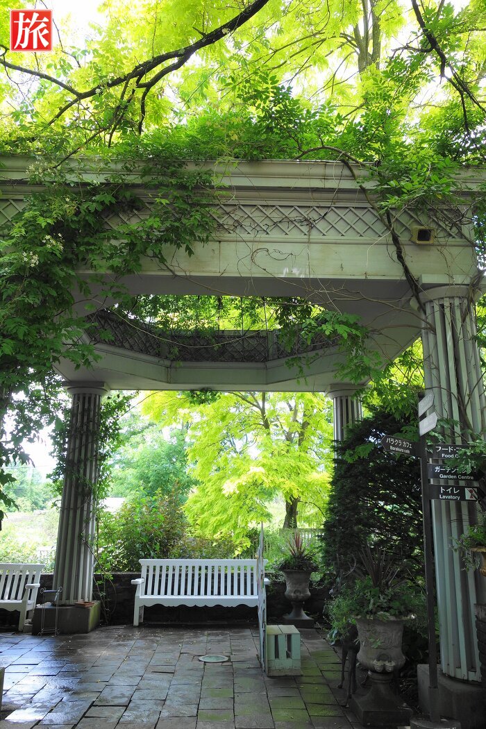 バラのパーゴラ。緑が眩しい中庭を望む。パーゴラ方向を振り返った様子。付近から本店ショップ方向を眺めた風景。
