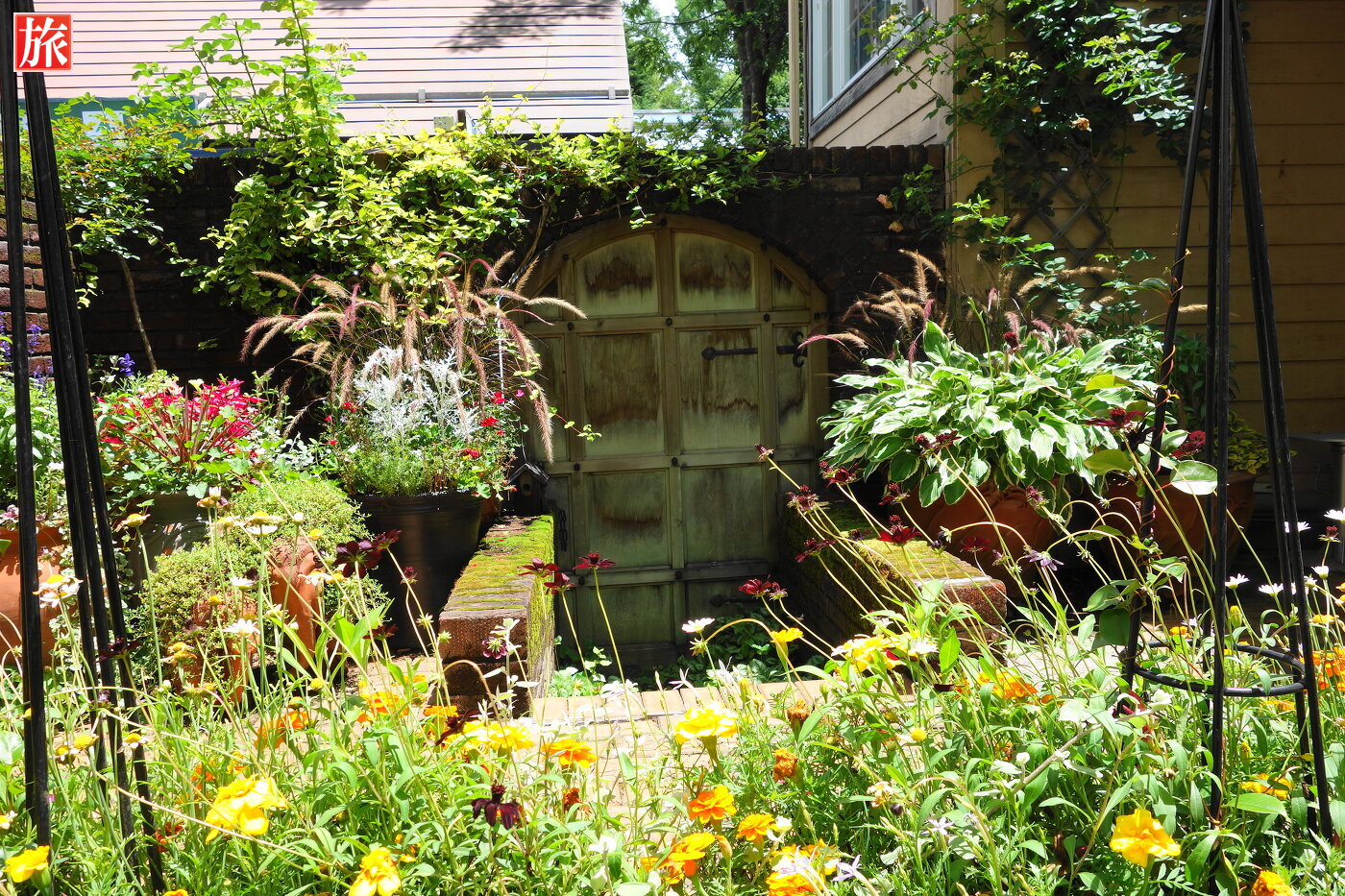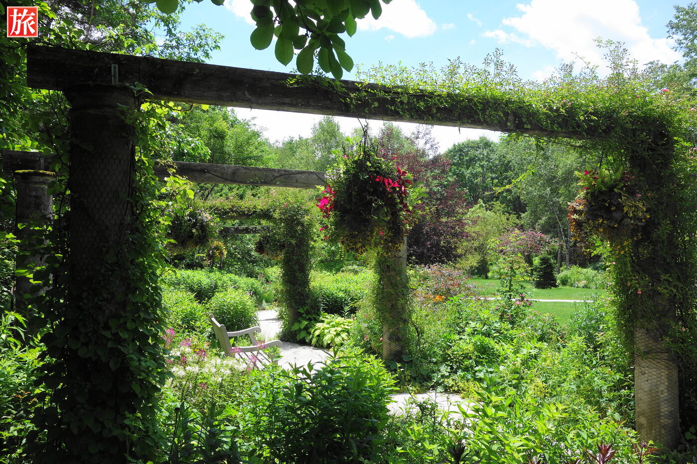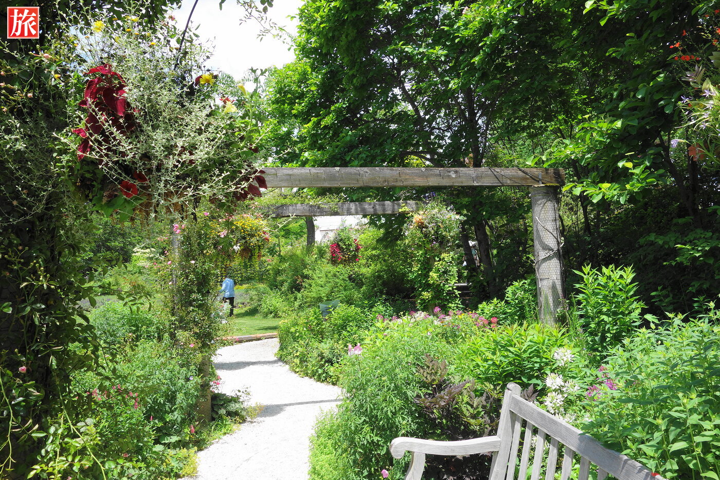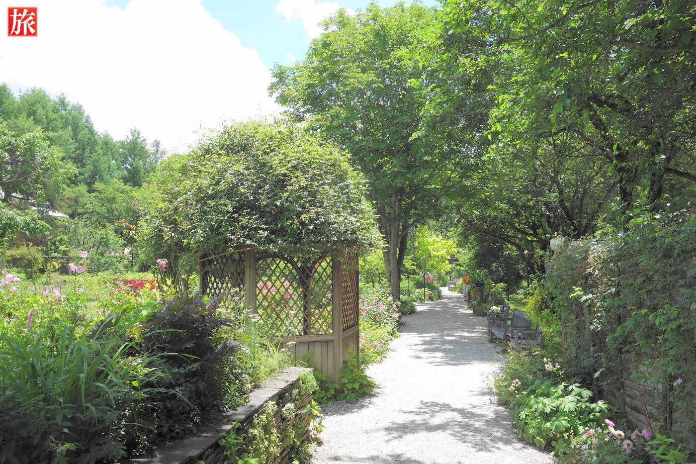 バラのパーゴラ。緑が眩しい中庭を望む。パーゴラ方向を振り返った様子。付近から本店ショップ方向を眺めた風景。