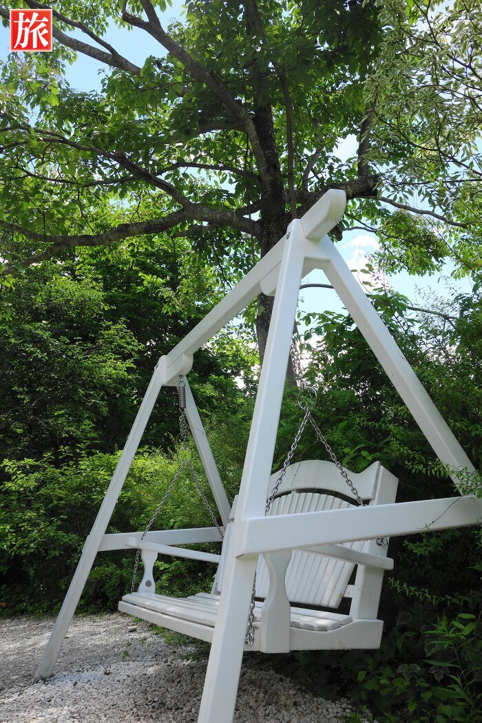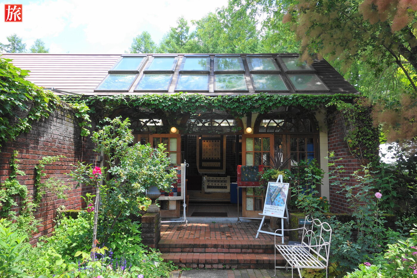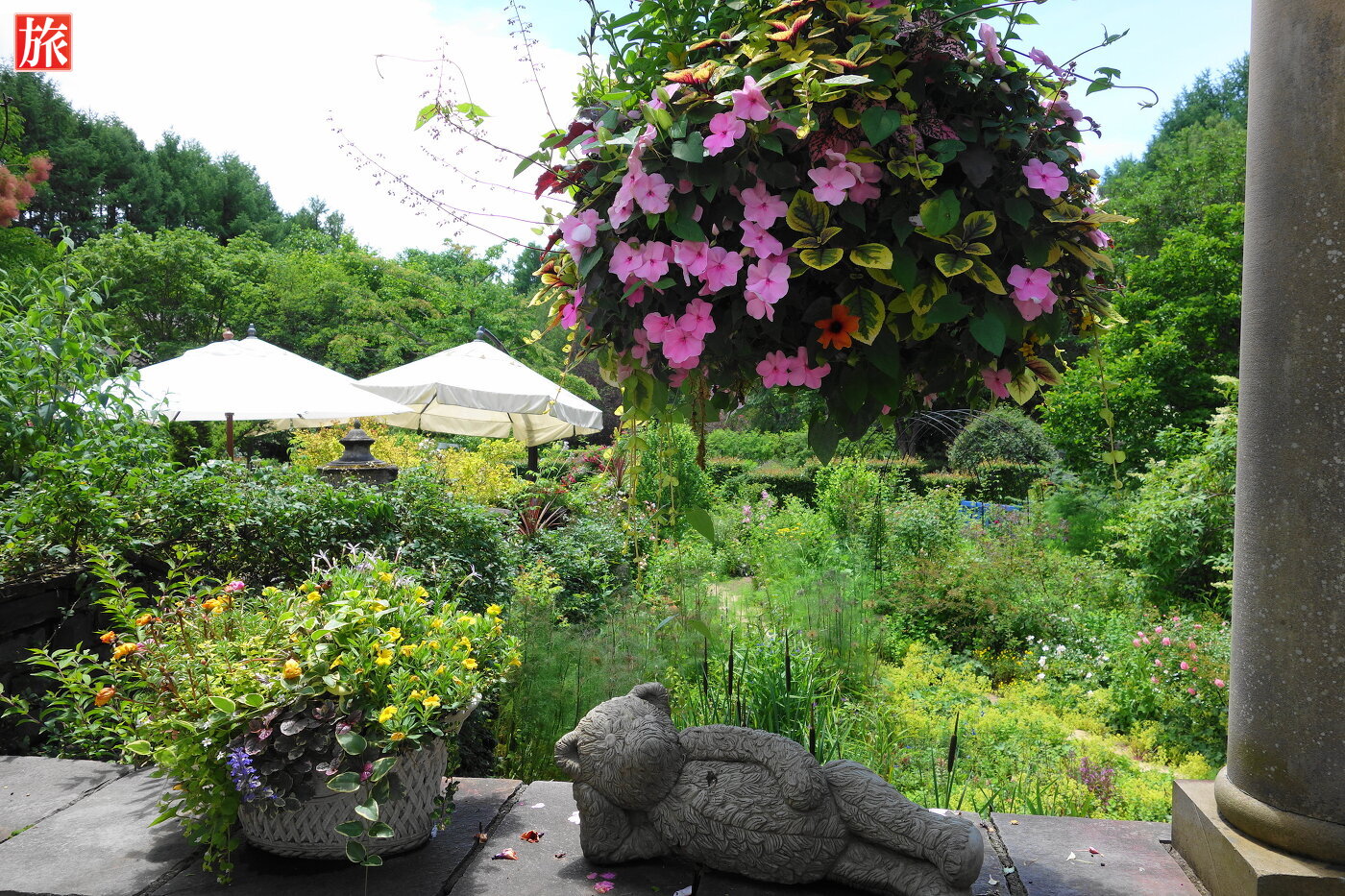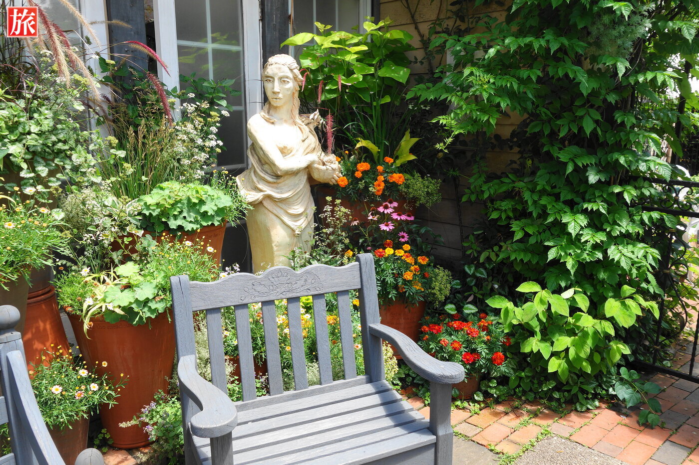 テラス席の前はハーブガーデンです。本店ショップ前にあるベンチと女性の像。オリジナル・ギャラリー。