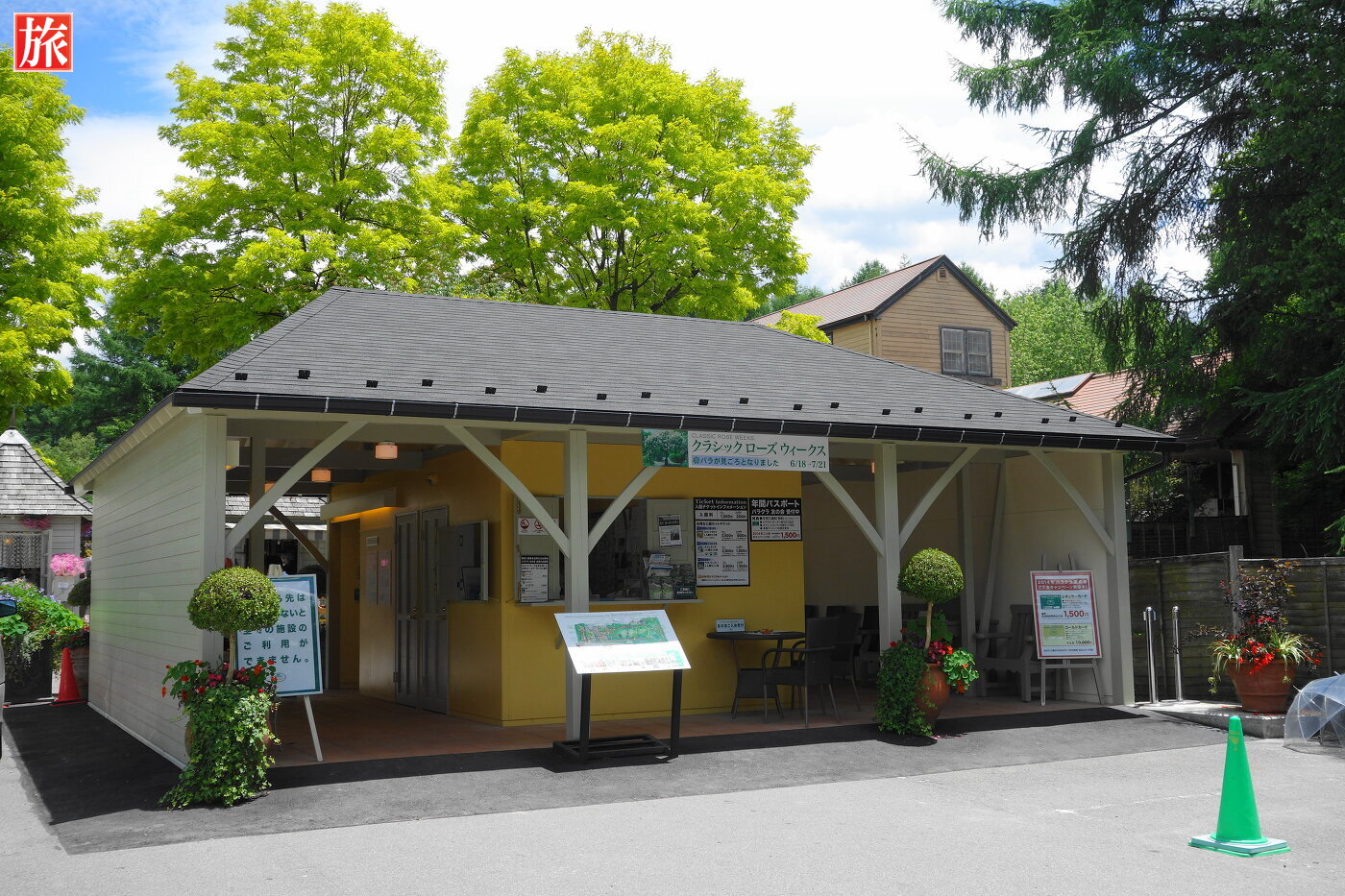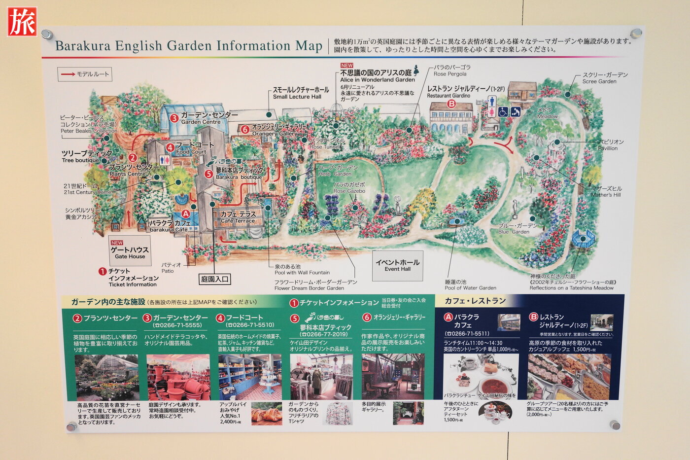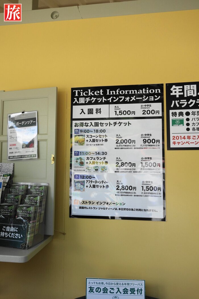 入園チケットのインフォメーション。時期により料金は異なり、当日は大人一人1500円でした。丸いシールがチケットの代わりです。ガーデンマップ。庭園入り口まで売店やフードコートがあります。