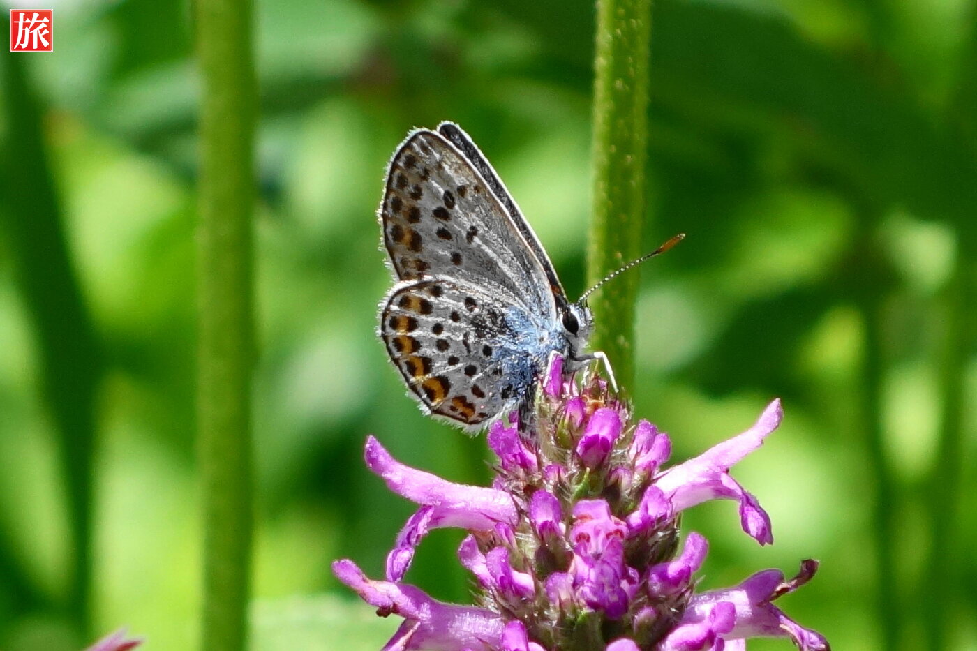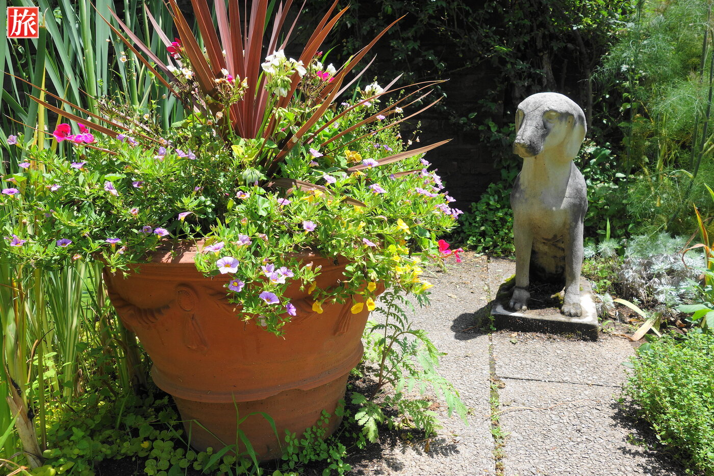 花の香りに誘われて蝶がやってきました。犬の像。振り返って見た様子。先に見えるバラのトンネル。右手には白いベンチが設置されていました。