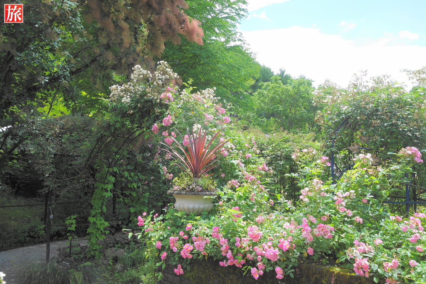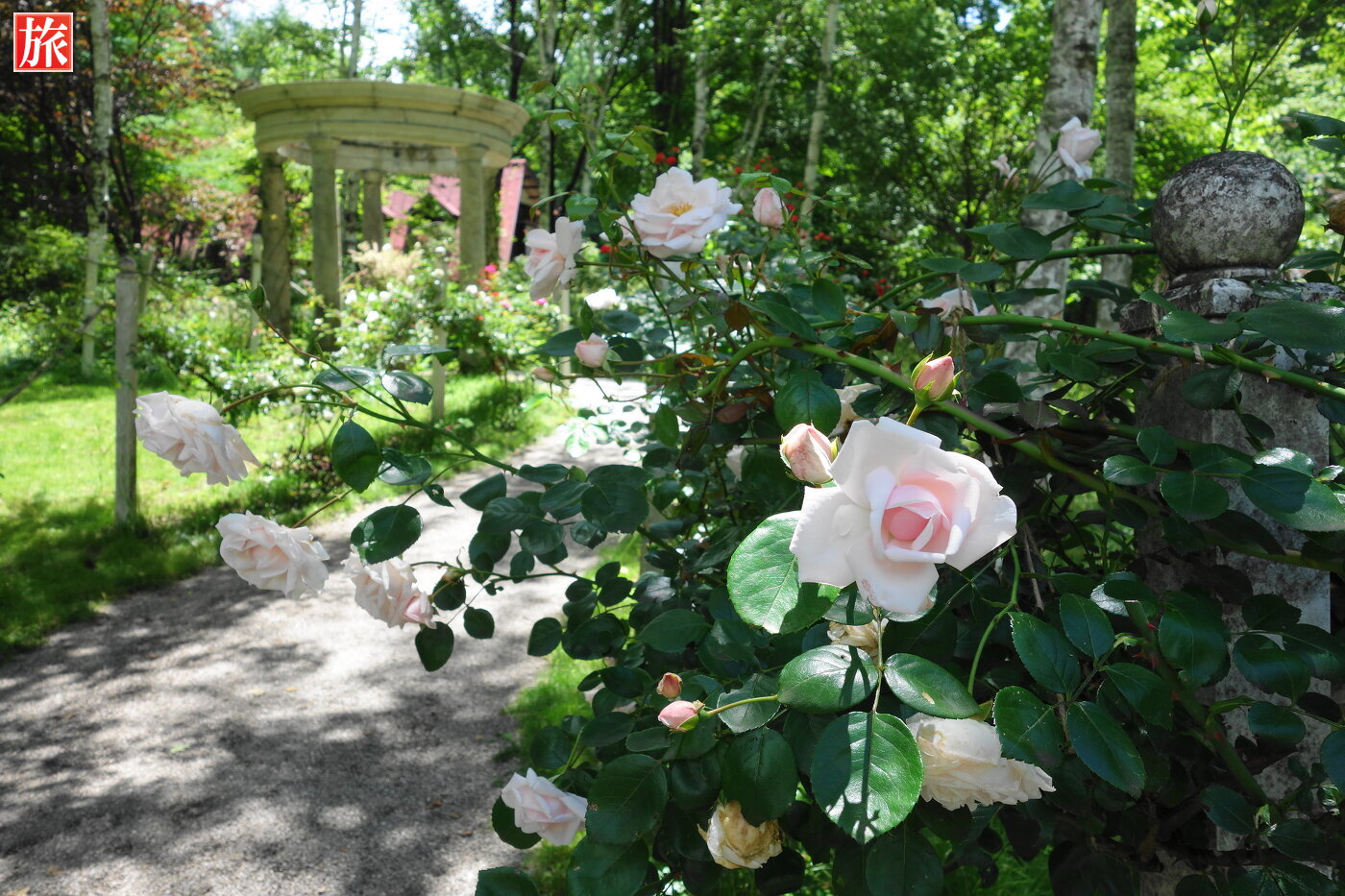 バラのトンネル入り口付近。トンネルをくぐります。レースガーデン付近にある女神像と白いつるバラ「ランブリングレクター」。