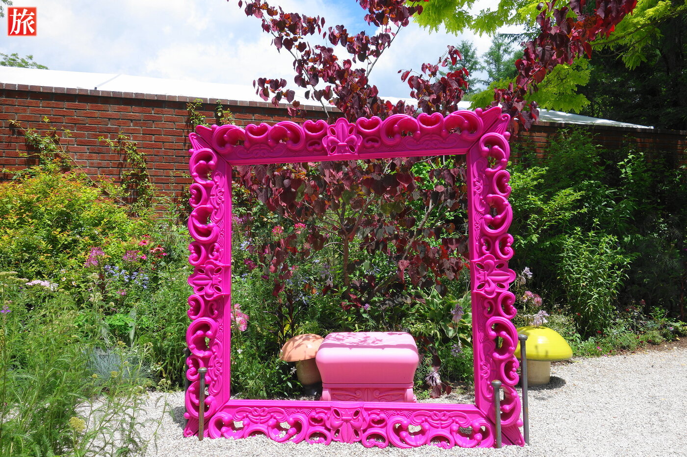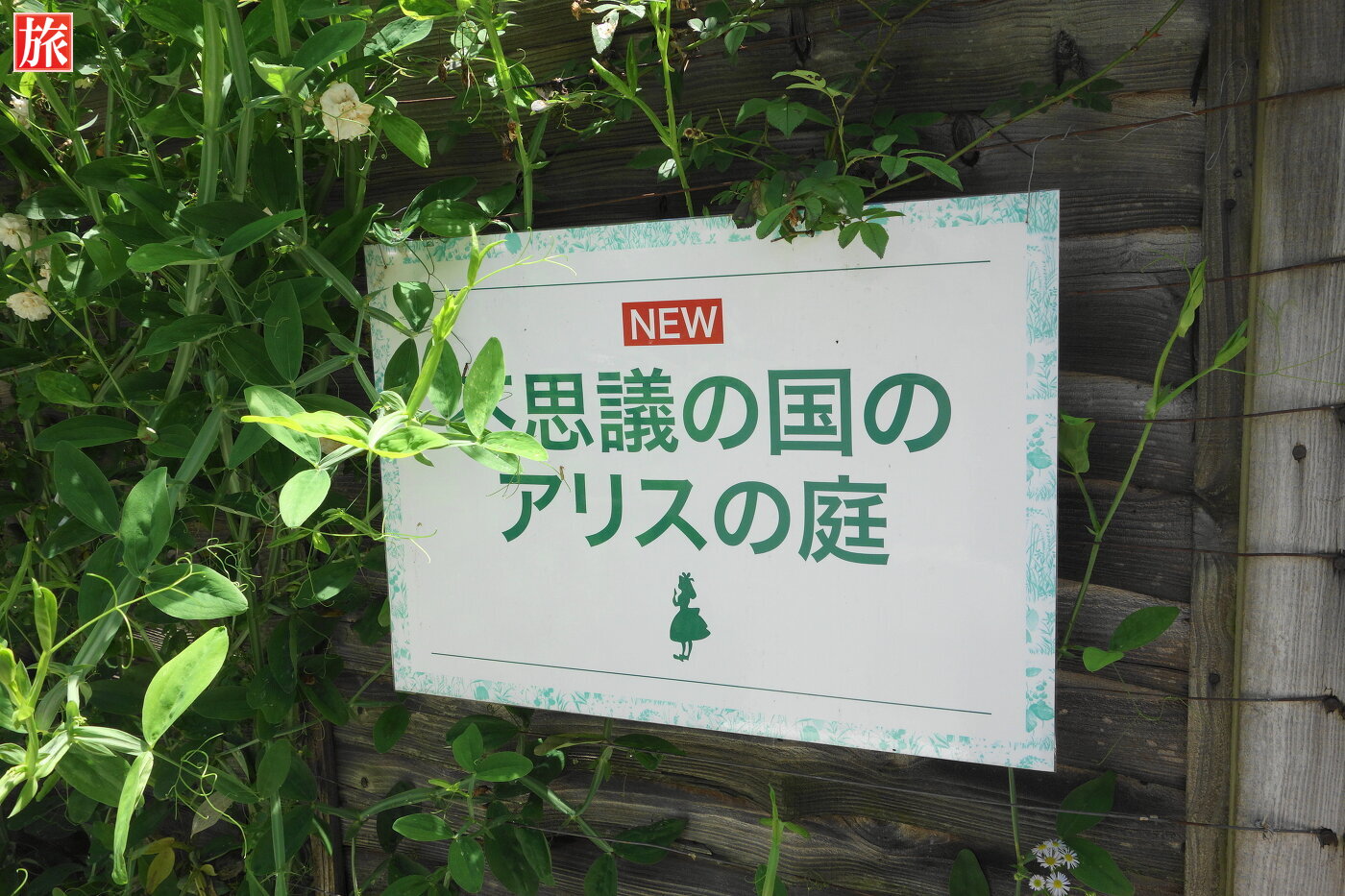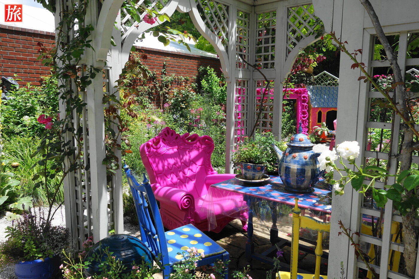 左側に不思議の国のアリスの庭がありました。ティーパーティの様子を表現しているようです。記念写真が取れるように額があります。