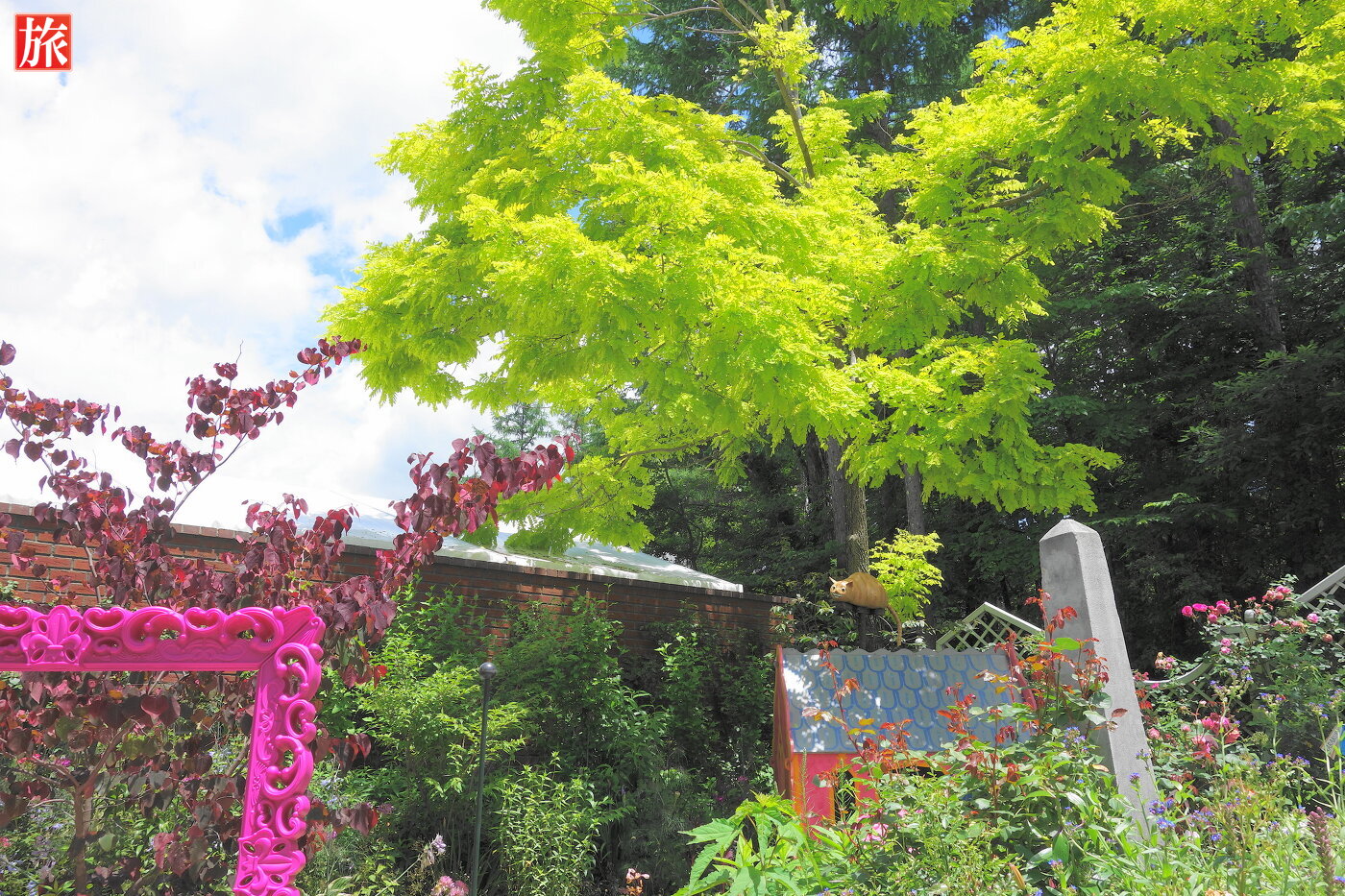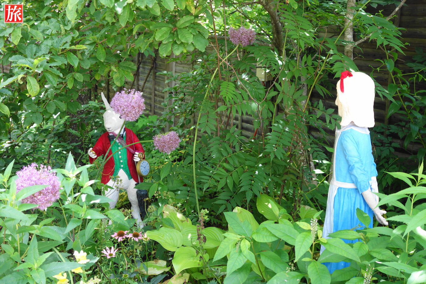 不思議の国のアリスの庭の様子。チェシャ猫の人形があります。アリスとうさぎ。