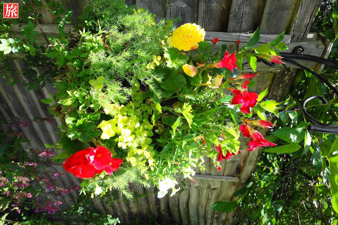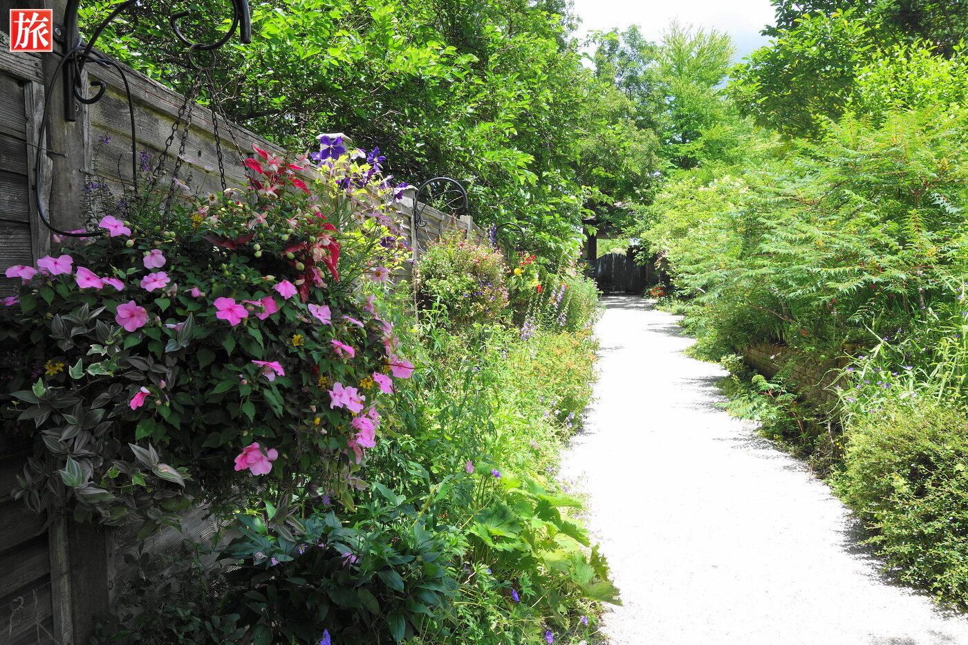 バラのガセボ方向を眺める。そろそろ出口です。振り返って見た様子。色とりどりの花が咲いていました。