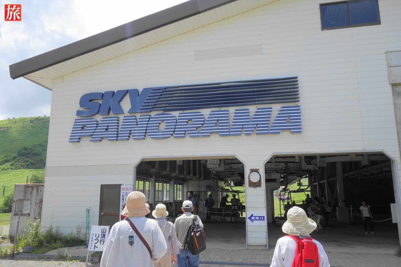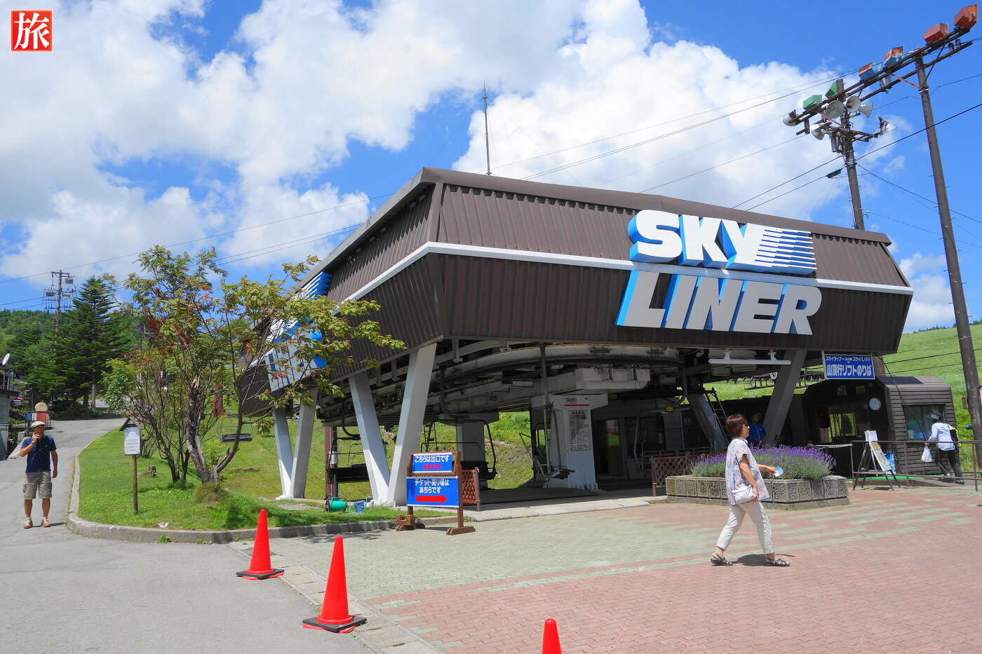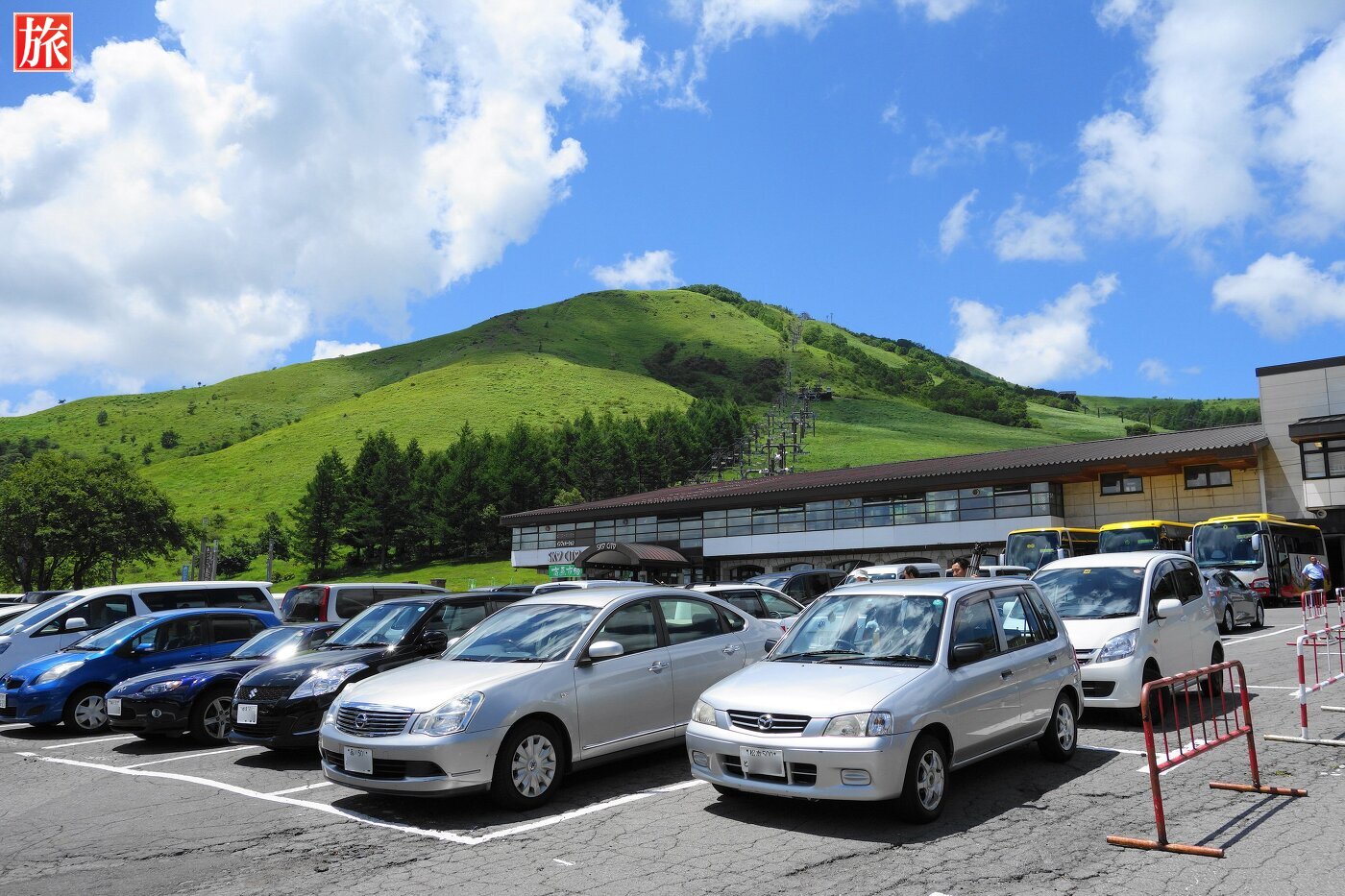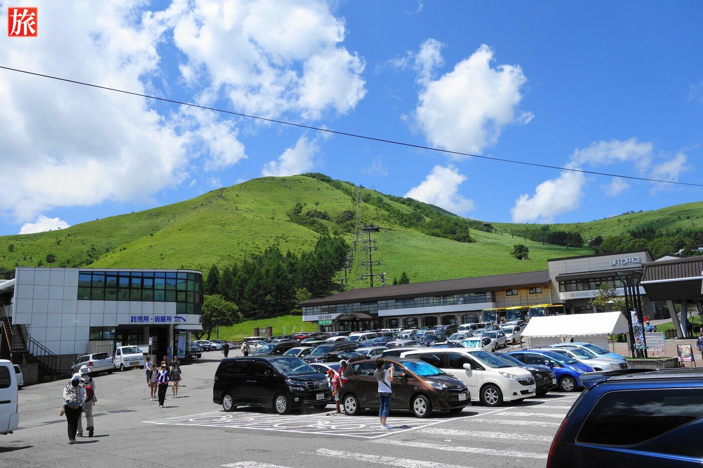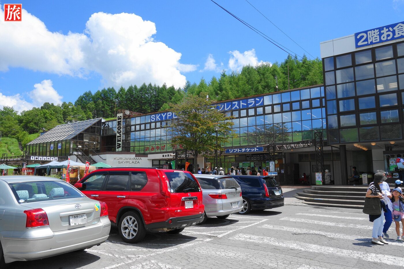 スカイライナー乗り場。駐車場から車山山頂を見た風景。スカイプラザ・1Fでリフトチケットを販売しています。