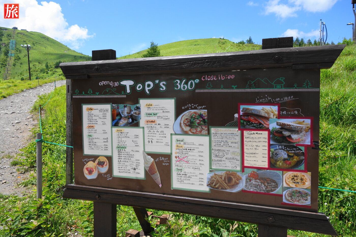中腹から蓼科山を見た風景。レストランのTOP’S360があります。レストランのメニュー。