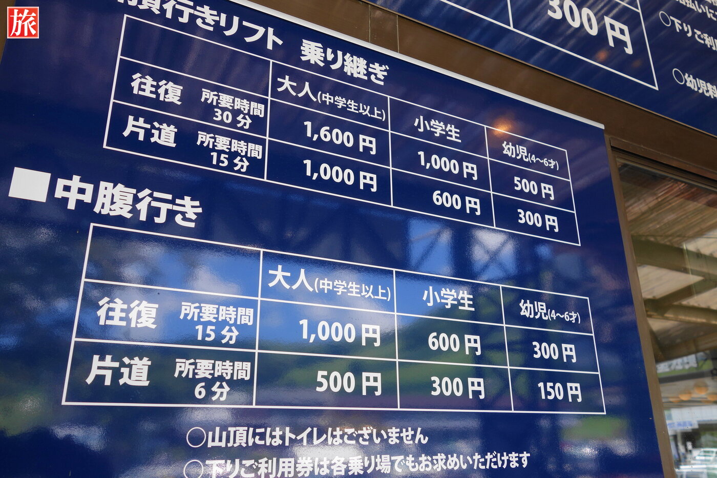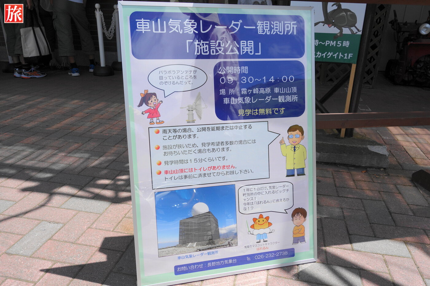 リフトチケットの料金表。車山展望リフトの案内図。山頂往復券。大人一人1600円でした。スカイライナー乗り場付近に車山気象レーダー観測所の施設公開の案内がありました。