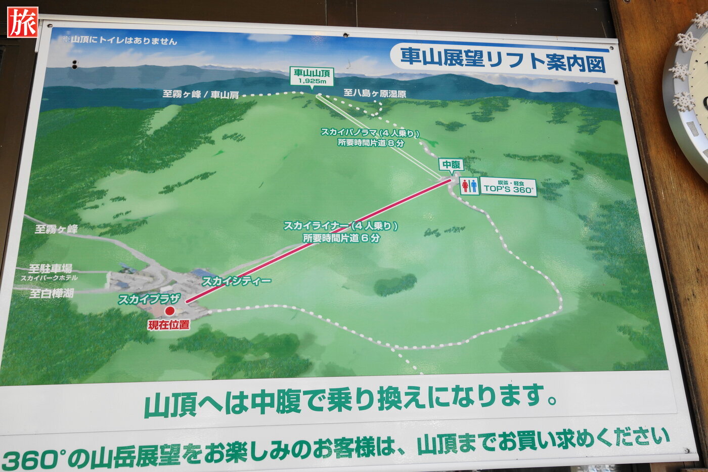 | 料金 | 展望リフト料金(大人:中学生以上、幼児:4歳~6歳) 車山高原山麓~車山山頂(スカイライナー・スカイパノラマ乗継ぎ) 往復:大人2400円、小学生1600円、幼児800円、片道:大人1600円、小学生1200円、幼児600円 車山高原山麓~中腹(スカイライナーのみ利用) 往復:大人1600円、小学生1200円、幼児600円、片道:大人800円、小学生600円、幼児300円 中腹~車山山頂(スカイパノラマのみ利用) 往復:大人1600円、小学生1200円、幼児600円、片道:大人800円、小学生600円、幼児300円 |