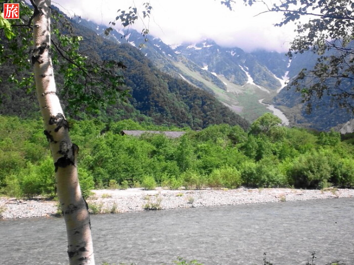 河童橋から上流方向を望む。橋を渡ると河童の休憩所と上高地白樺自然学校があります。ここからの風景が素晴らしい。