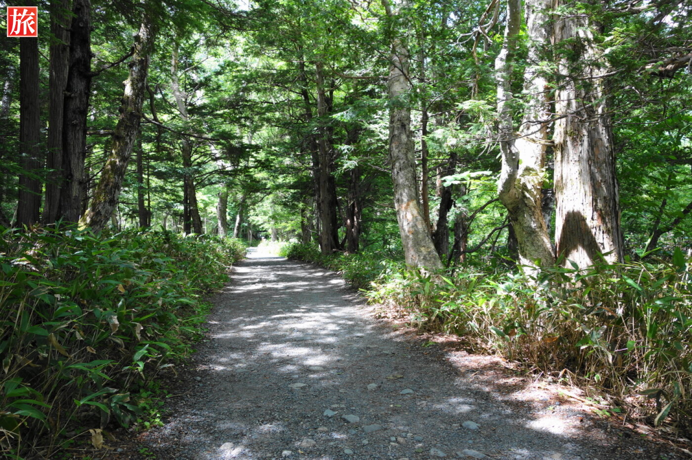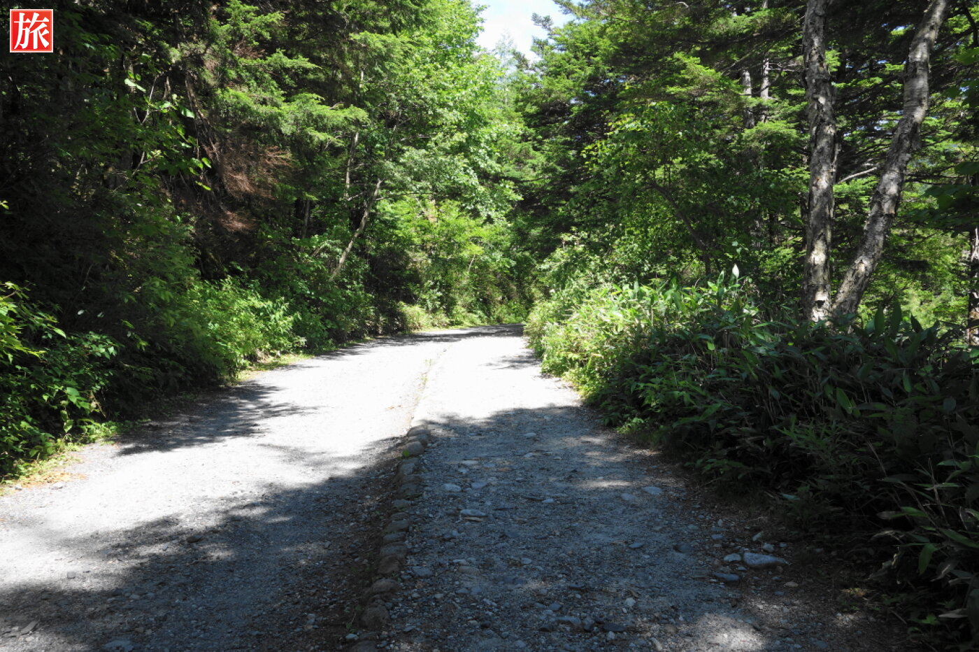 明神池まで1.1km地点です。管理車両用道路が明神自然探勝路に並行して走っています。あと明神池まで800mです。