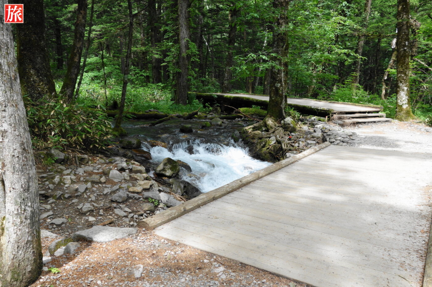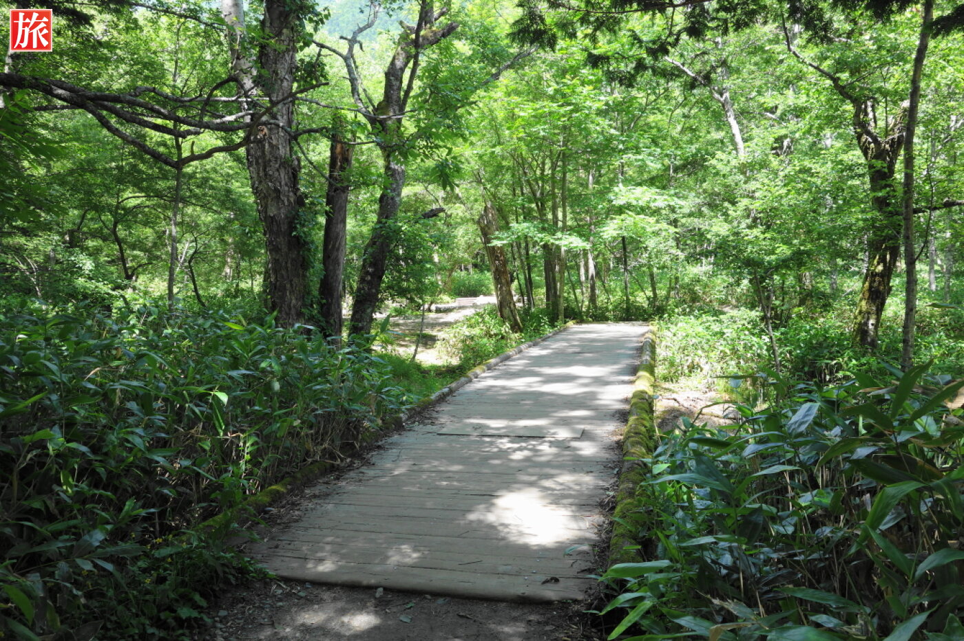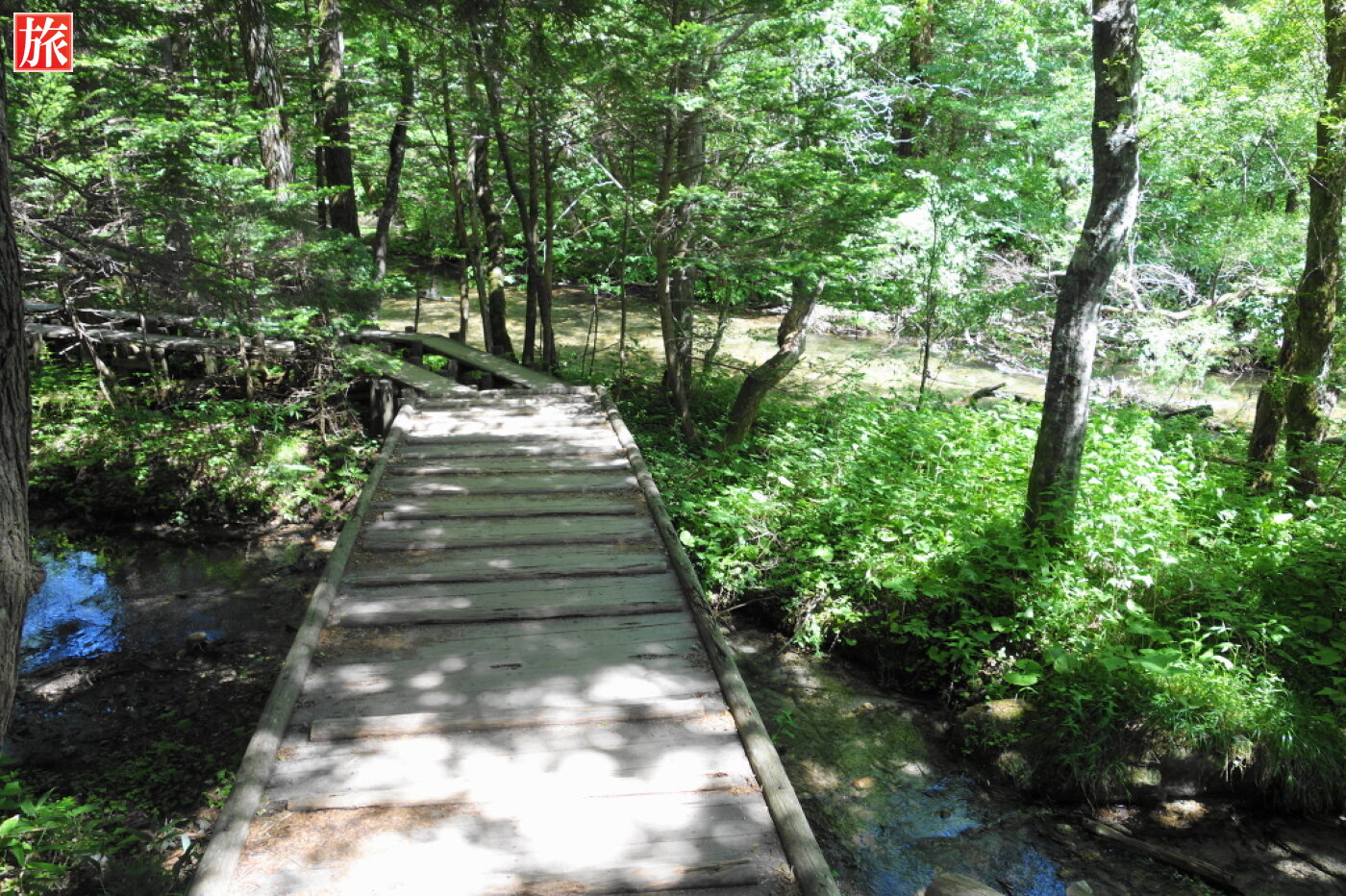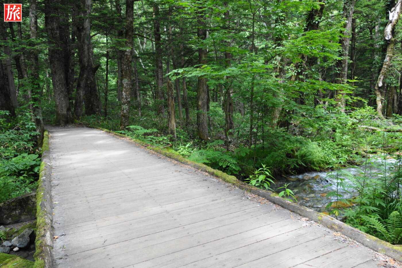 河童橋より200m程進んだ地点です。ここから明神池まで約3.3.kmあります。湧き水が作り出す湿原に小川が流れています。原生林に木道が整備されています。2本に分かれている木道の歩行ルールは、右側通行です。