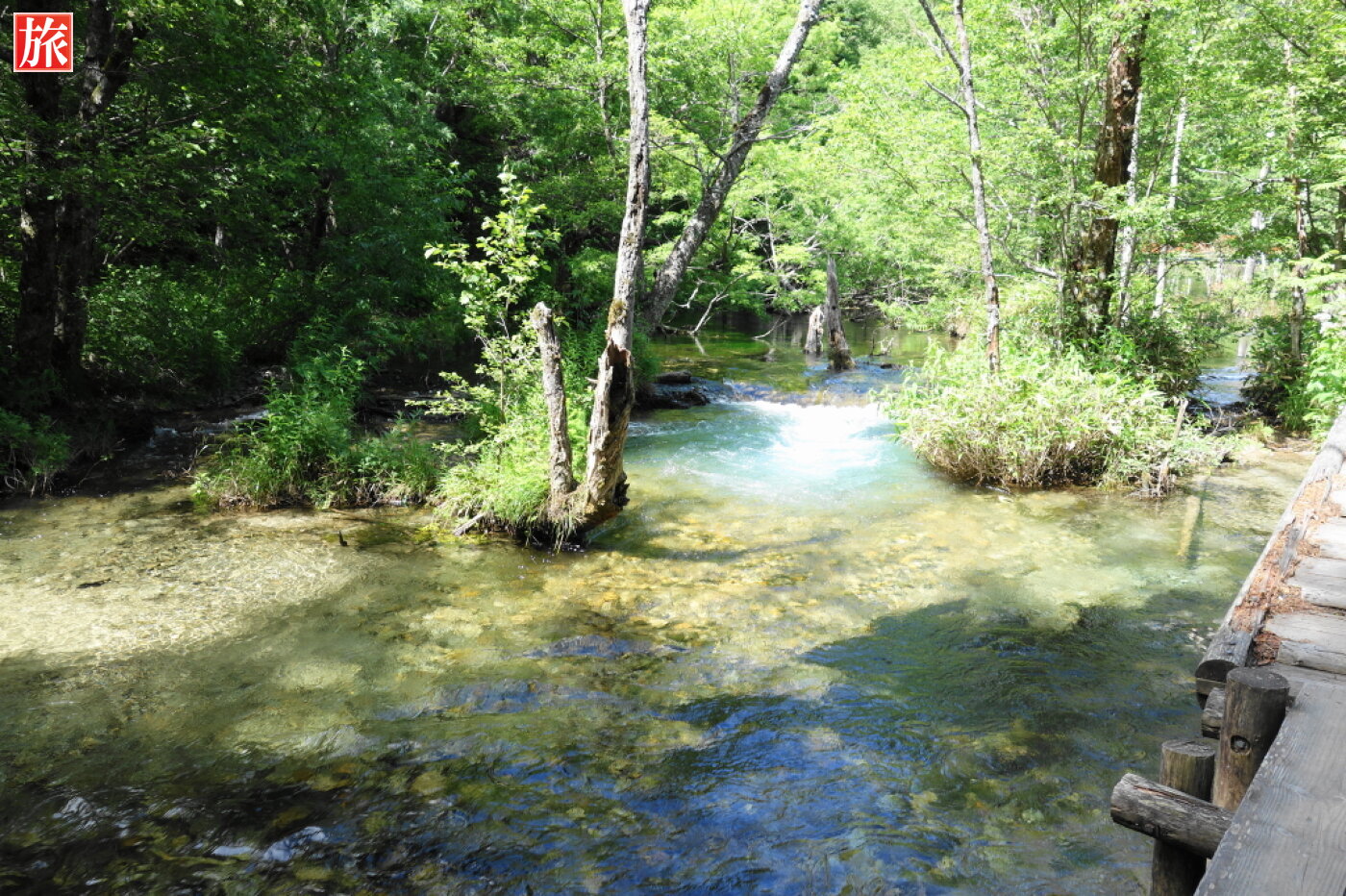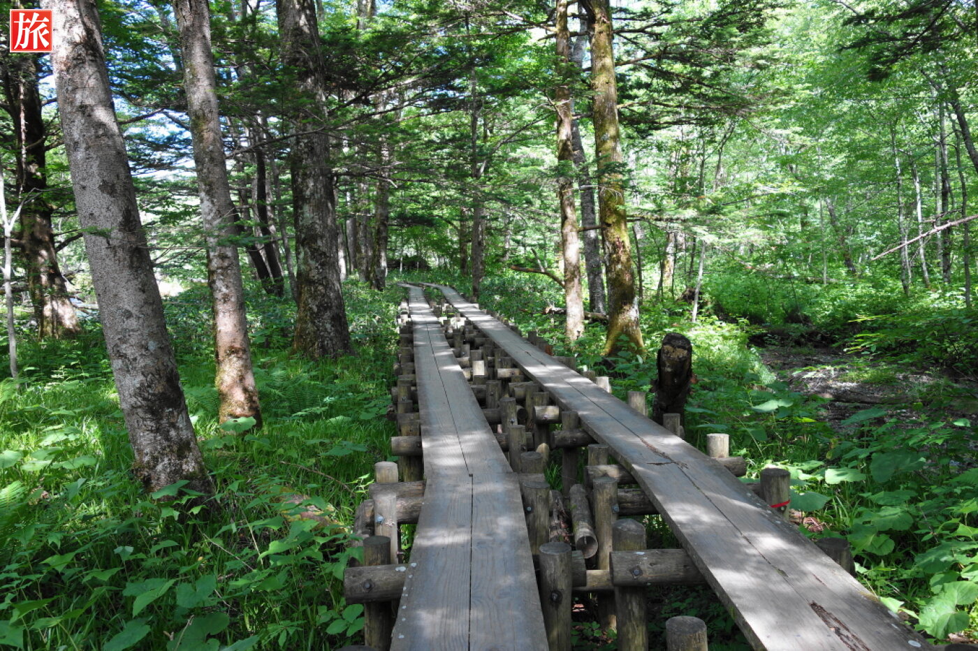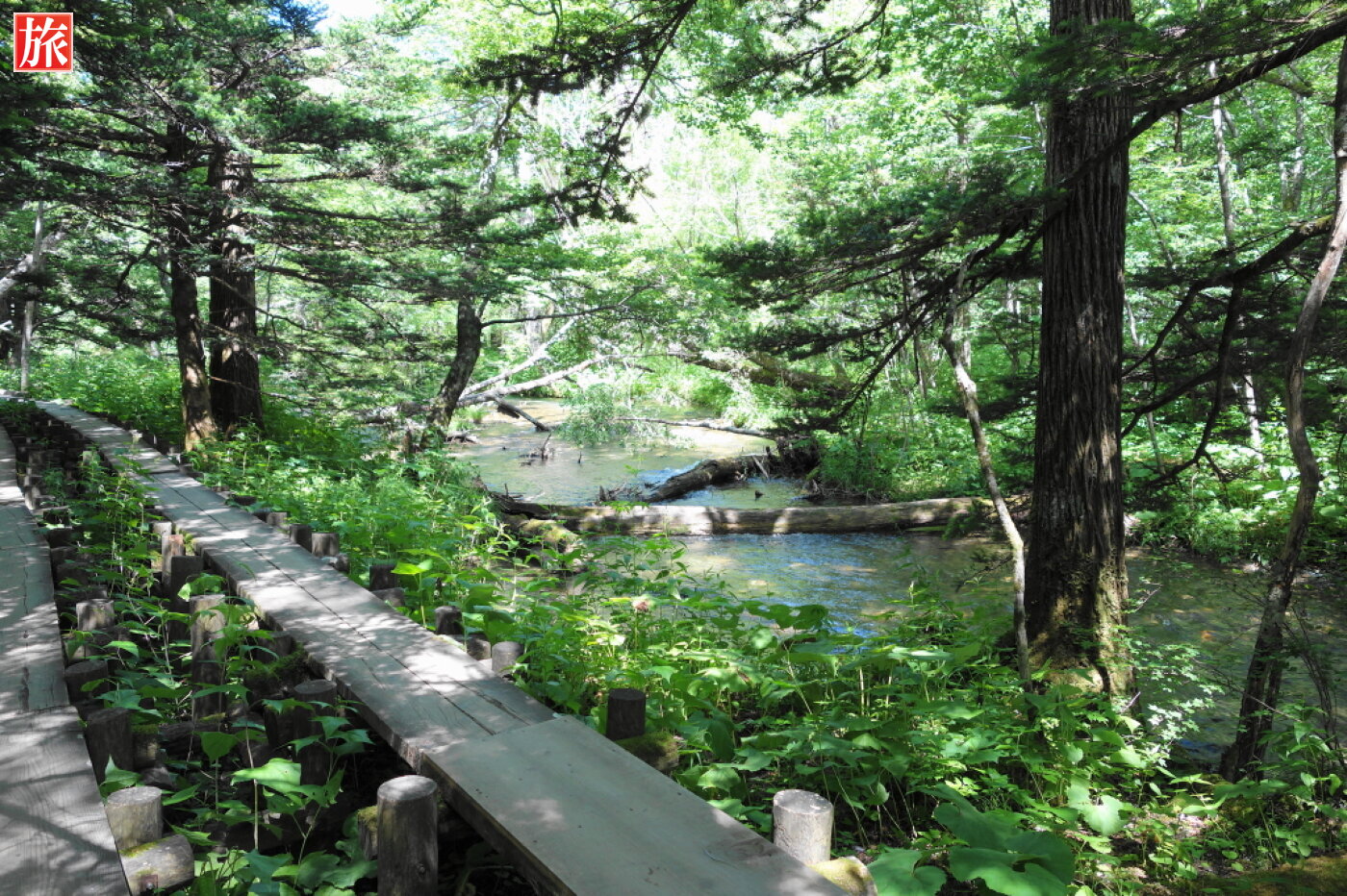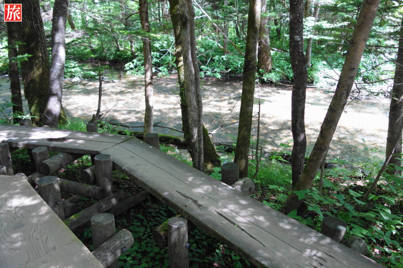 河童橋より200m程進んだ地点です。ここから明神池まで約3.3.kmあります。湧き水が作り出す湿原に小川が流れています。原生林に木道が整備されています。2本に分かれている木道の歩行ルールは、右側通行です。