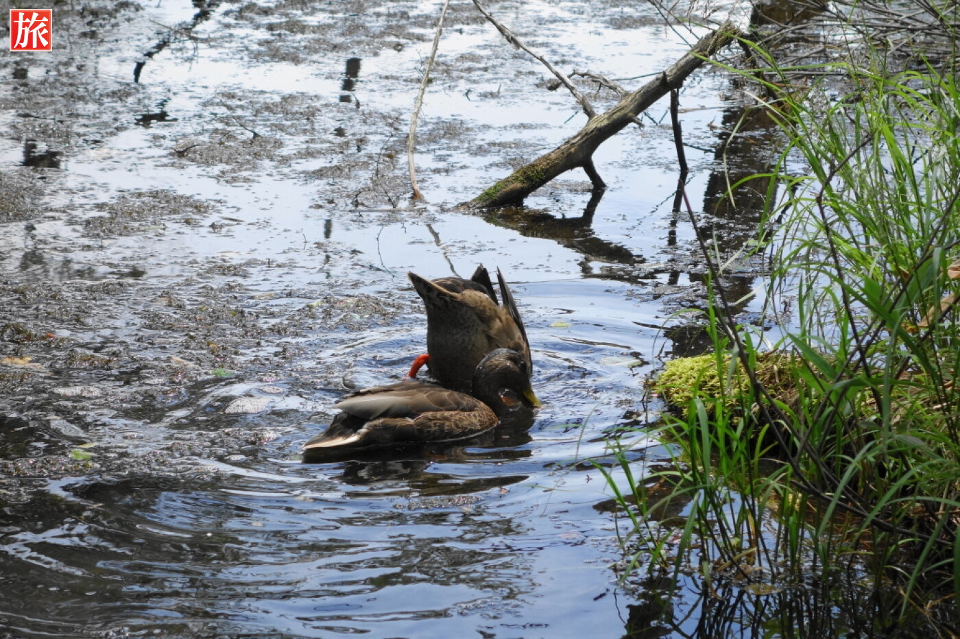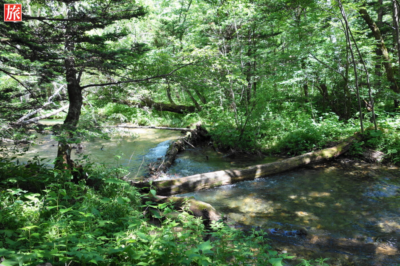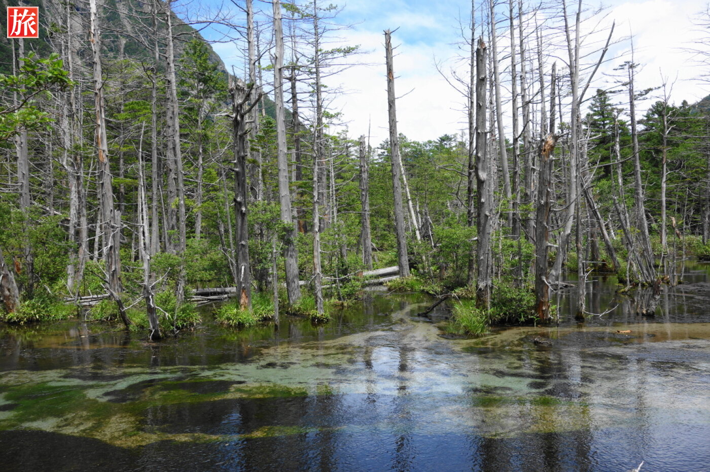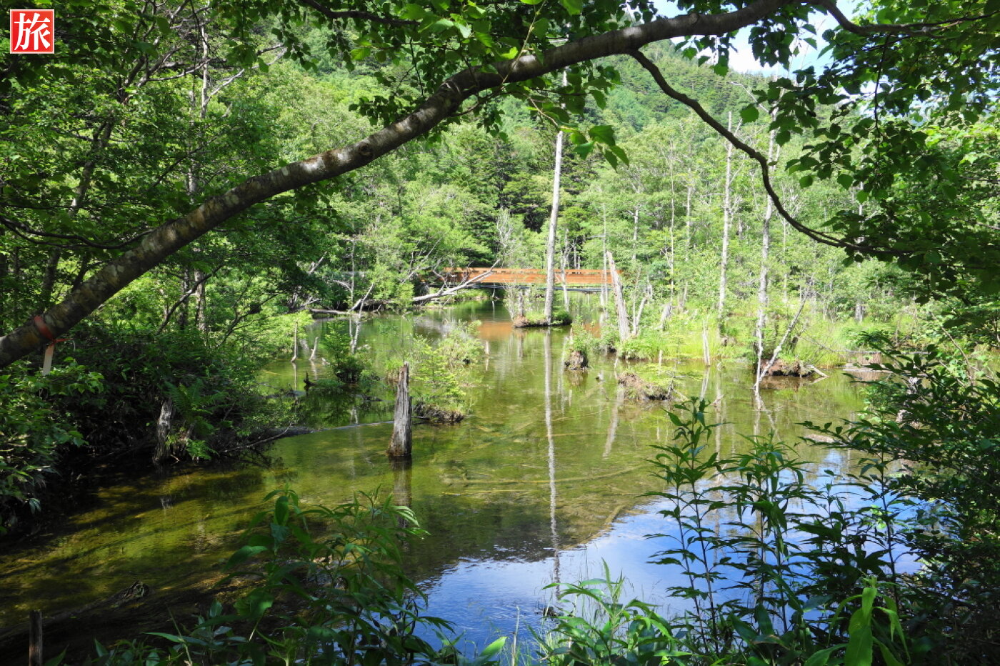 河童橋より200m程進んだ地点です。ここから明神池まで約3.3.kmあります。湧き水が作り出す湿原に小川が流れています。原生林に木道が整備されています。2本に分かれている木道の歩行ルールは、右側通行です。